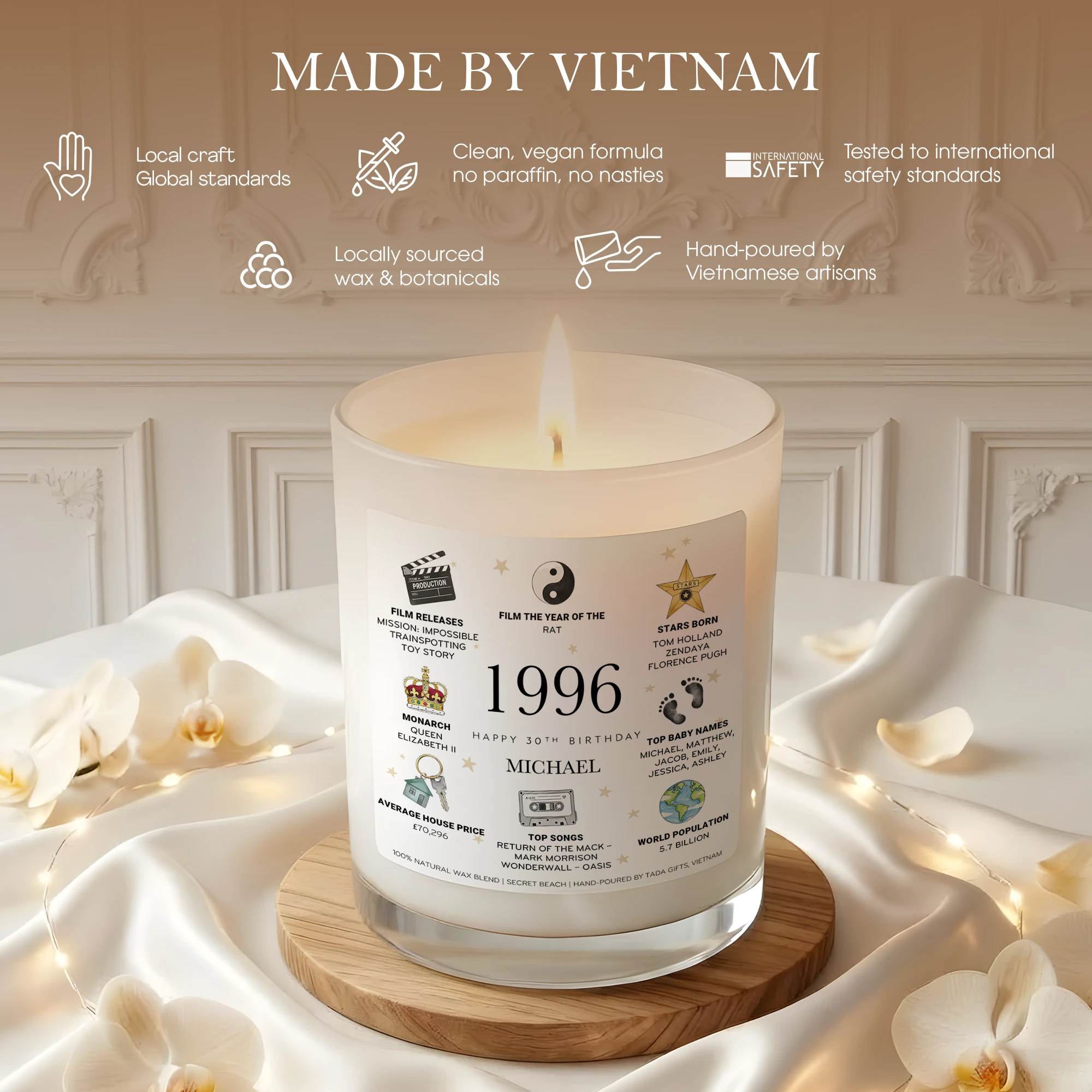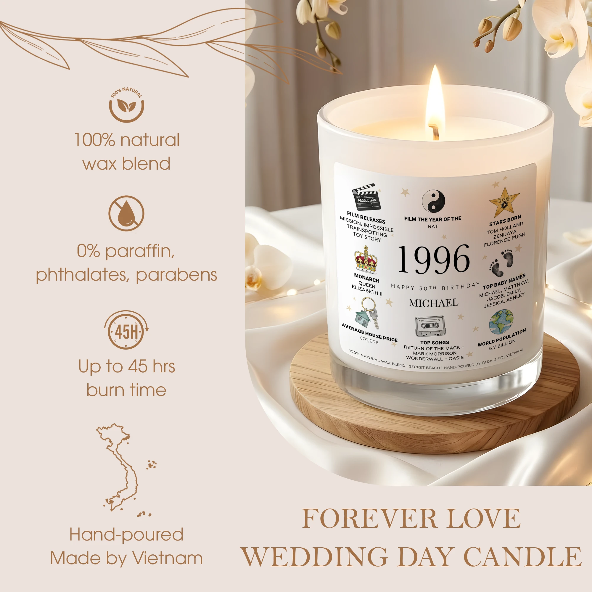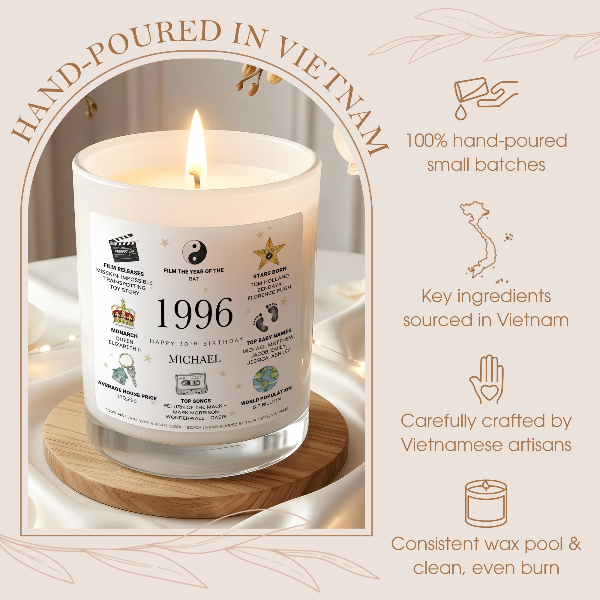 Personalized 1996 Birthday Candle for Him, Custom Name 30th Birthday Gift, Unique Gift for Brother, Husband, Friend, 1996 Year You Were Born