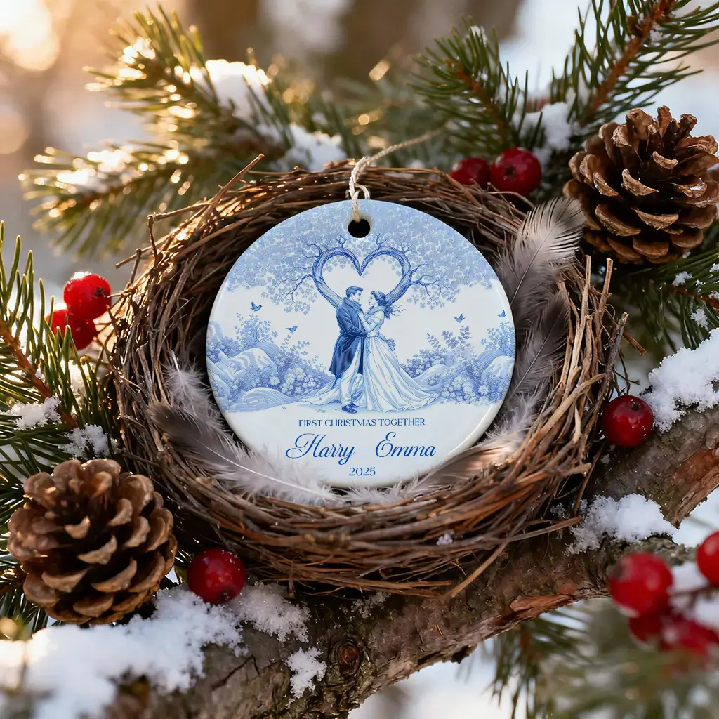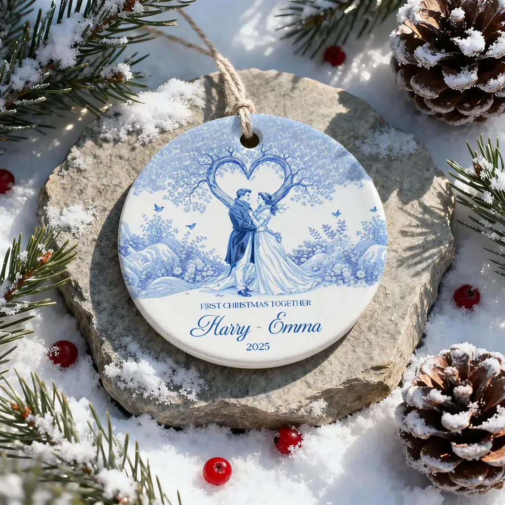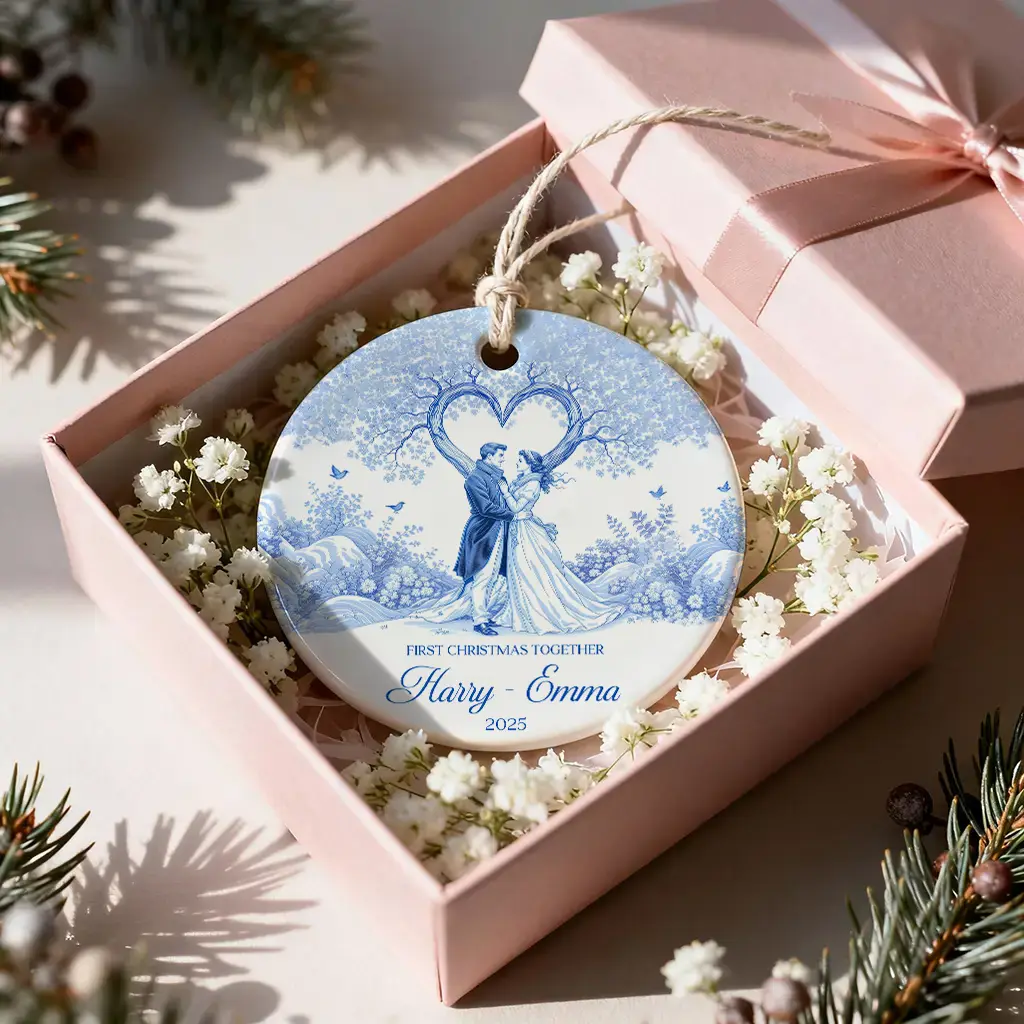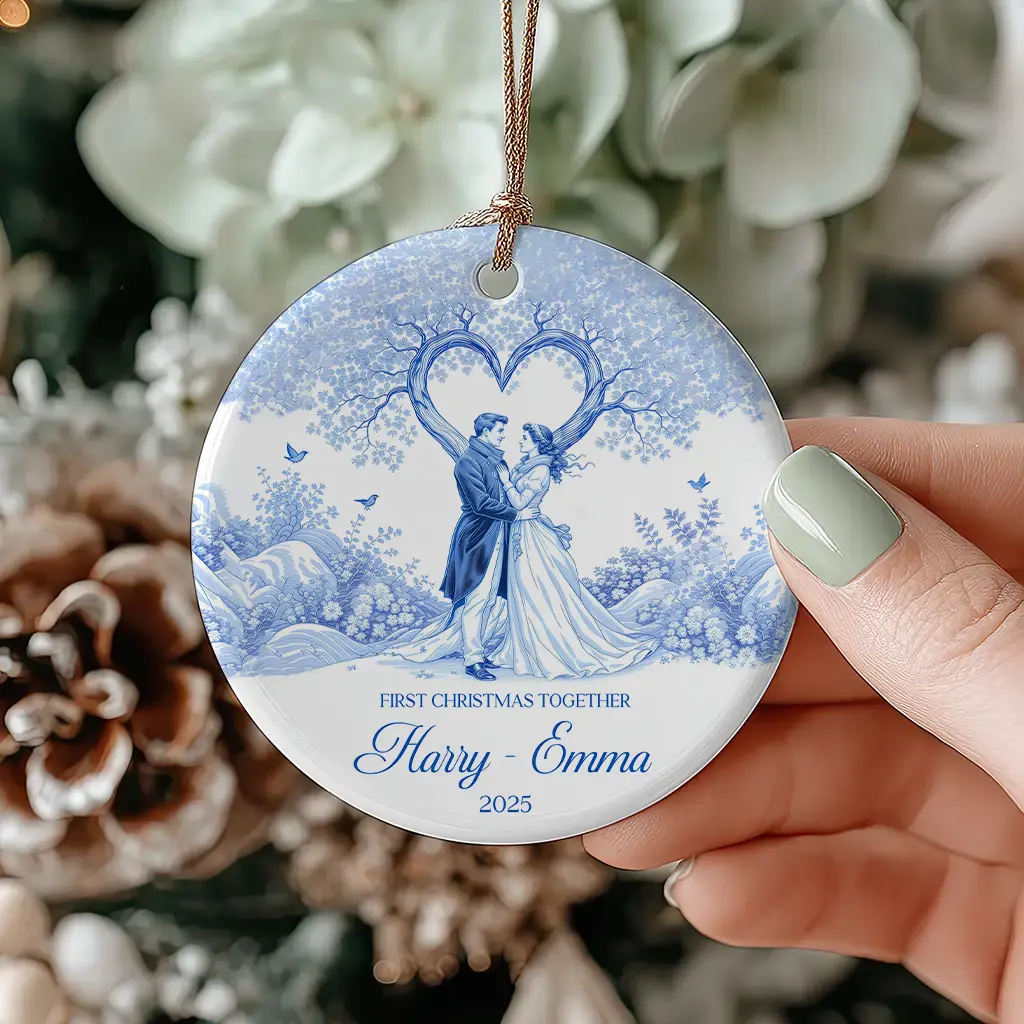 Blue and White Engagement Ornament, Toile Keepsake, Personalized Couple Gift, First Christmas Engaged 2025, Custom Ceramic Present