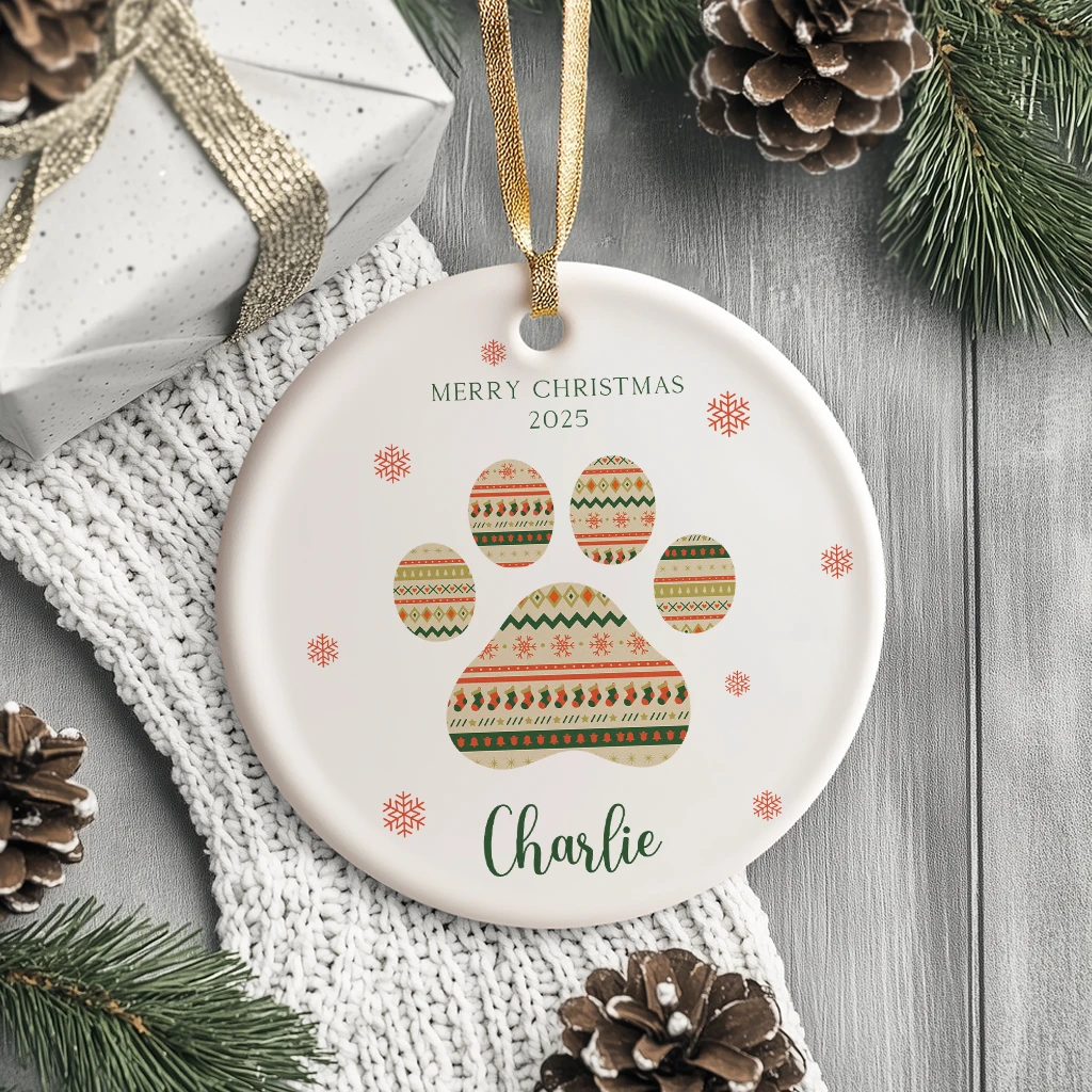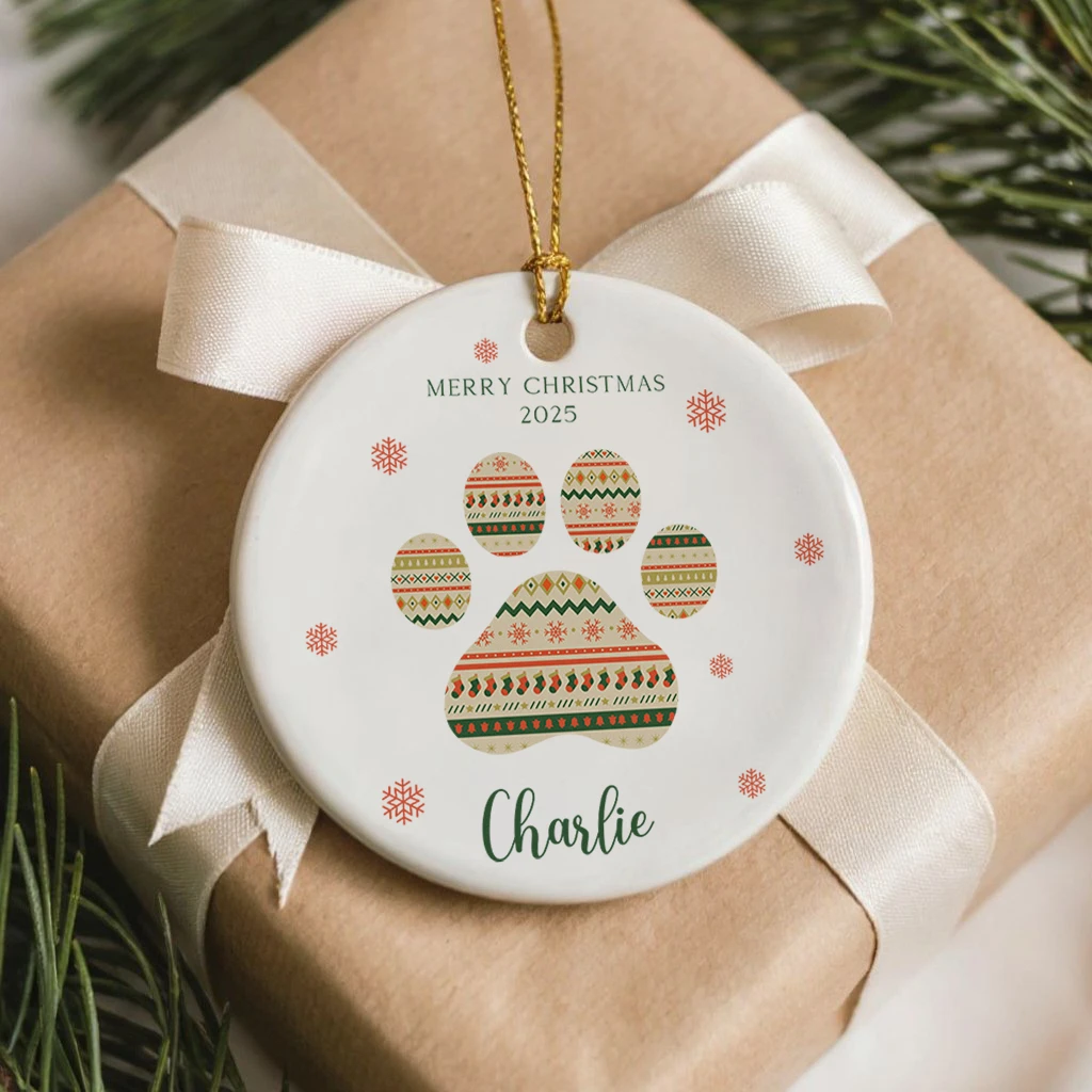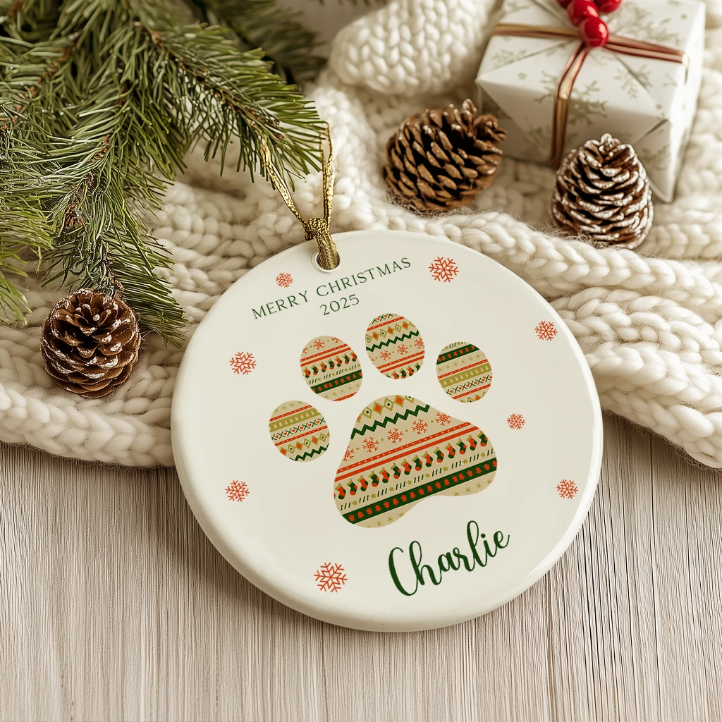 Cozy Cat Paw Print Christmas Ornament | Personalized Feline Name Ornament | Holiday Sweater Pattern Cat Lover Gift