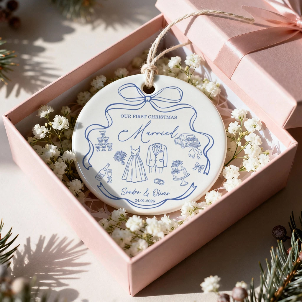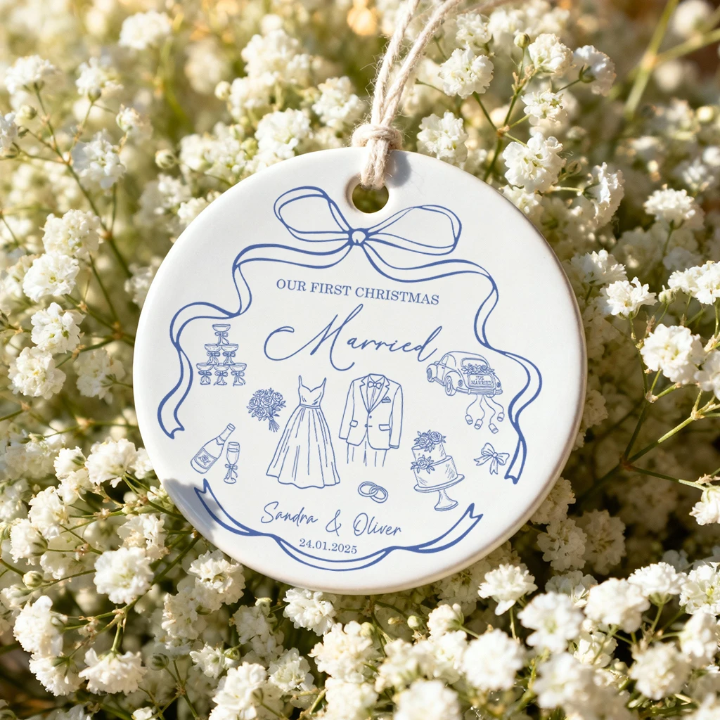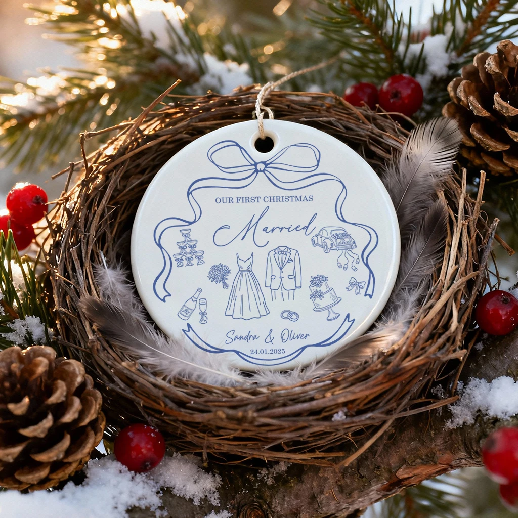 Custom Luxury Wedding Ornament | Personalized Name and Date Ceramic Keepsake | Best Newlywed Christmas Gift