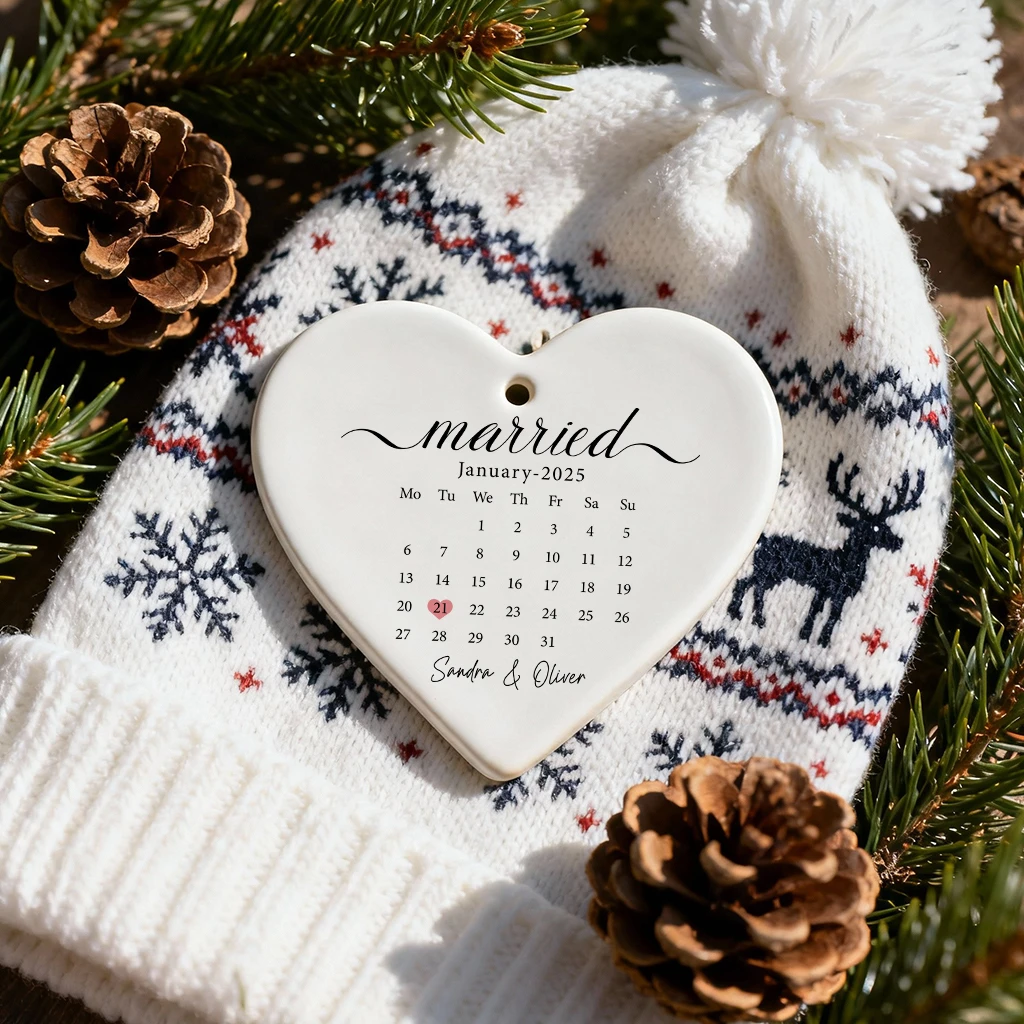 Custom Married Date Ornament, Personalized Ceramic Heart Calendar, Wedding Day Keepsake Gift for Couple