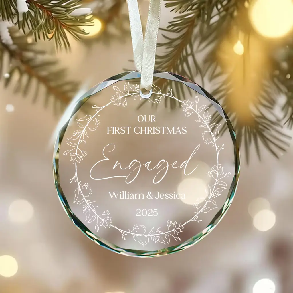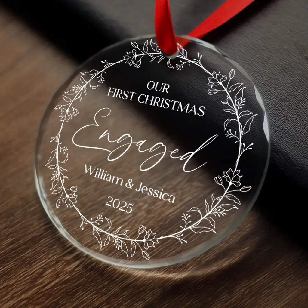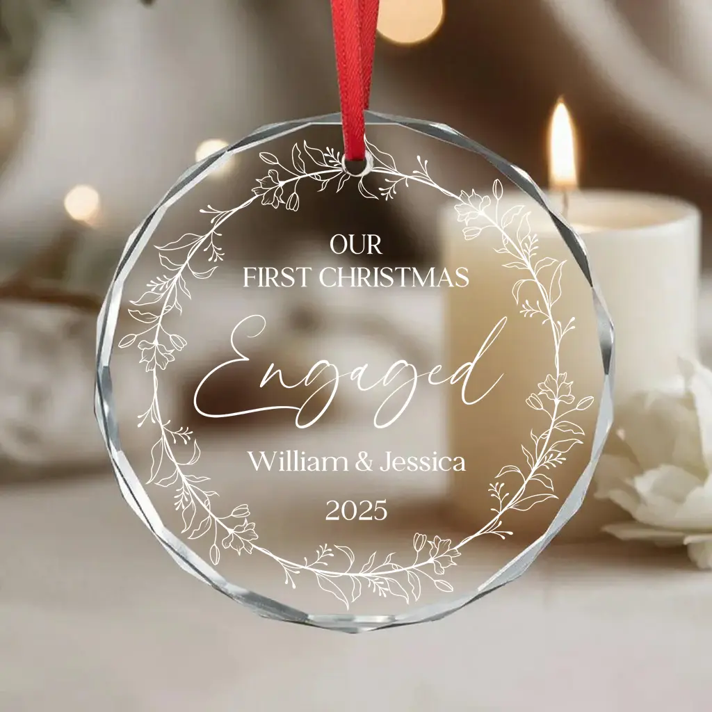 Custom Text Elegant Engaged Couple Glass Ornament | Personalized Wreath & Ribbon Keepsake