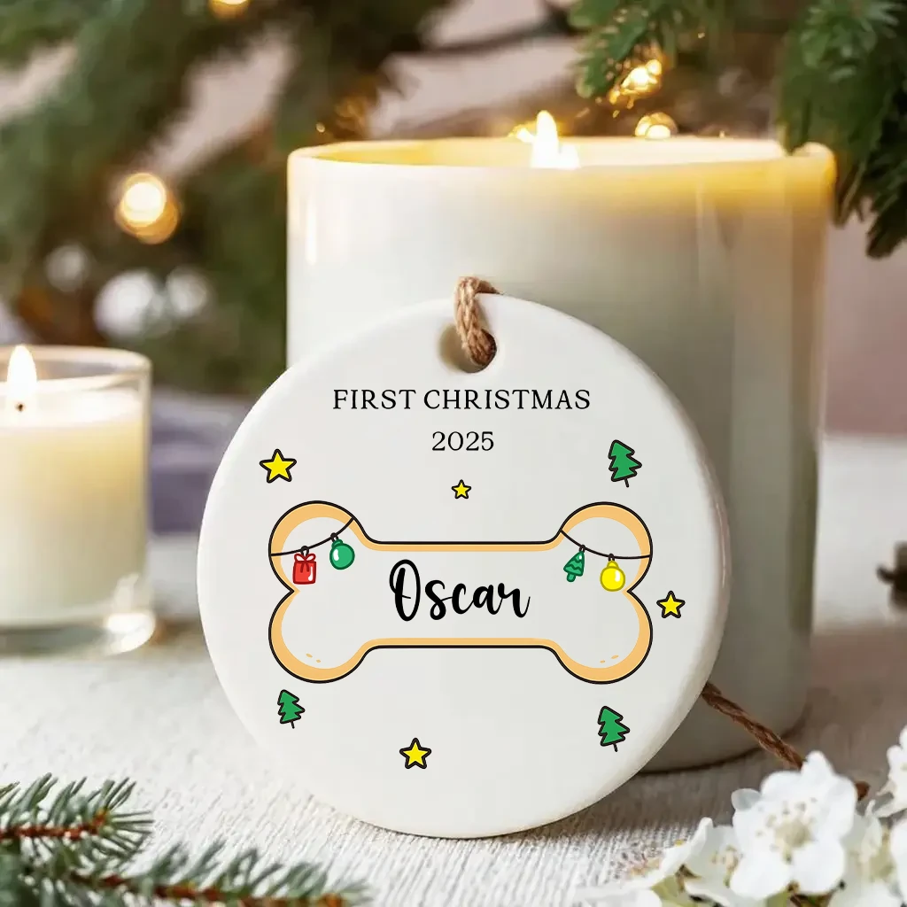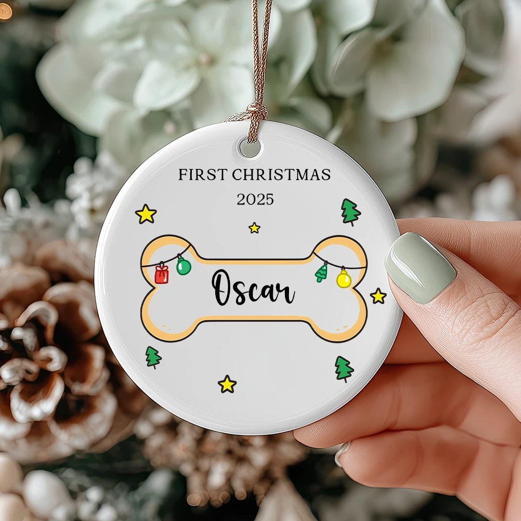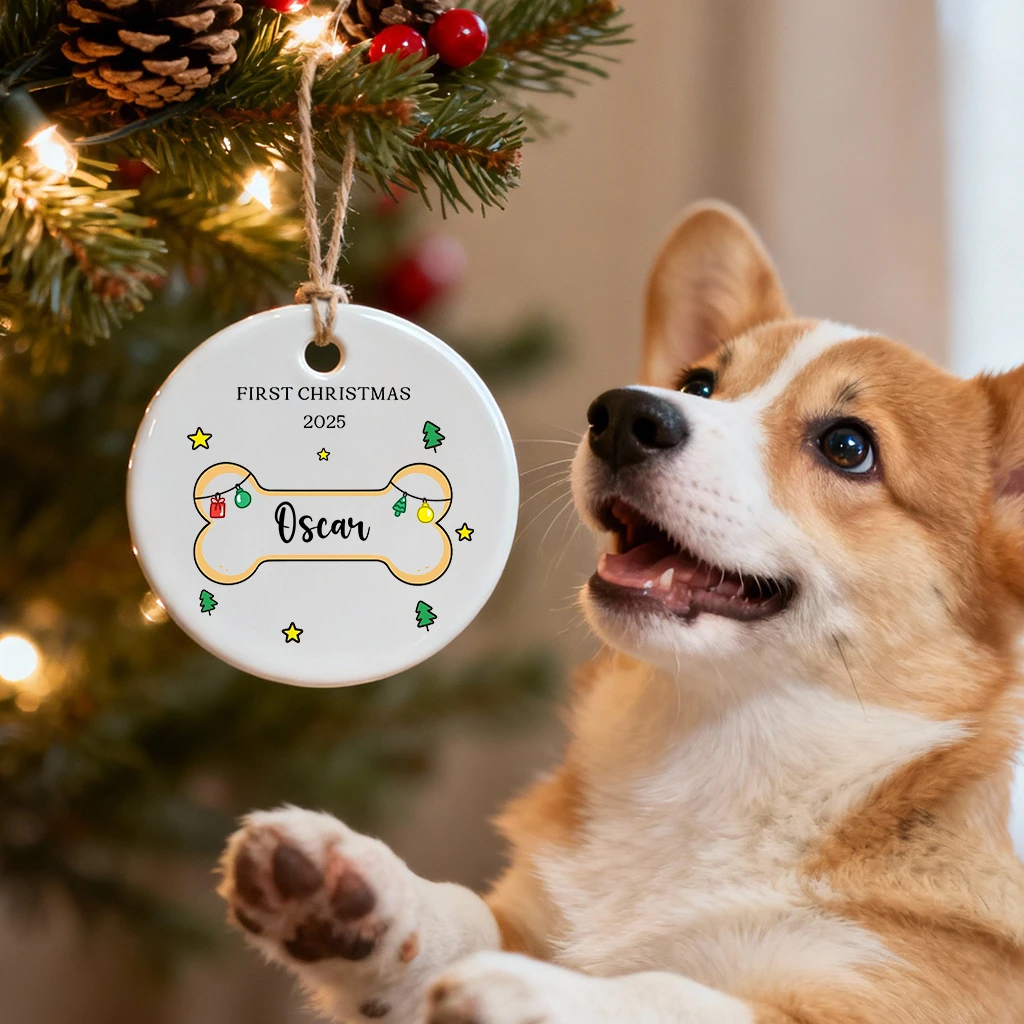 Dog Bone Shape First Christmas Ornament | Personalized Pet Name & Year | Glossy Ceramic, Ready to Hang 2025