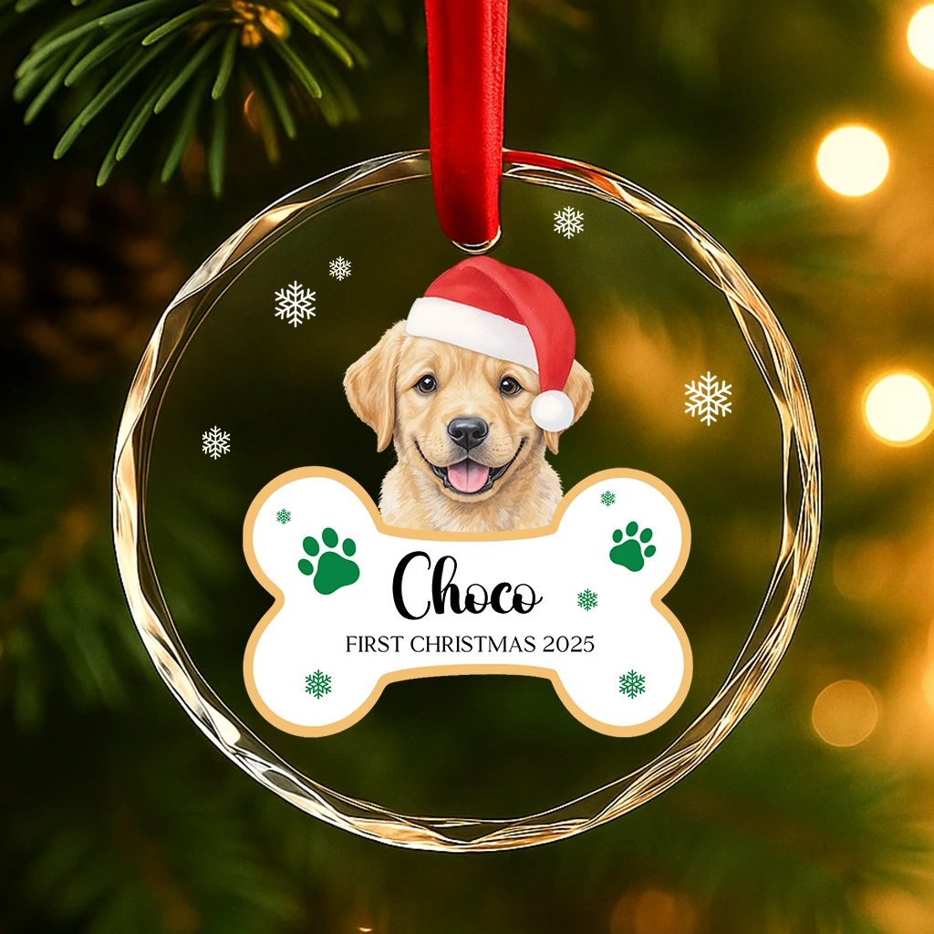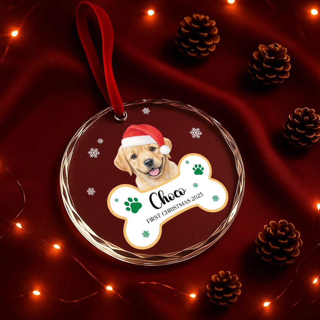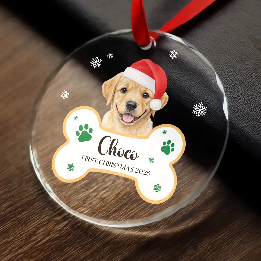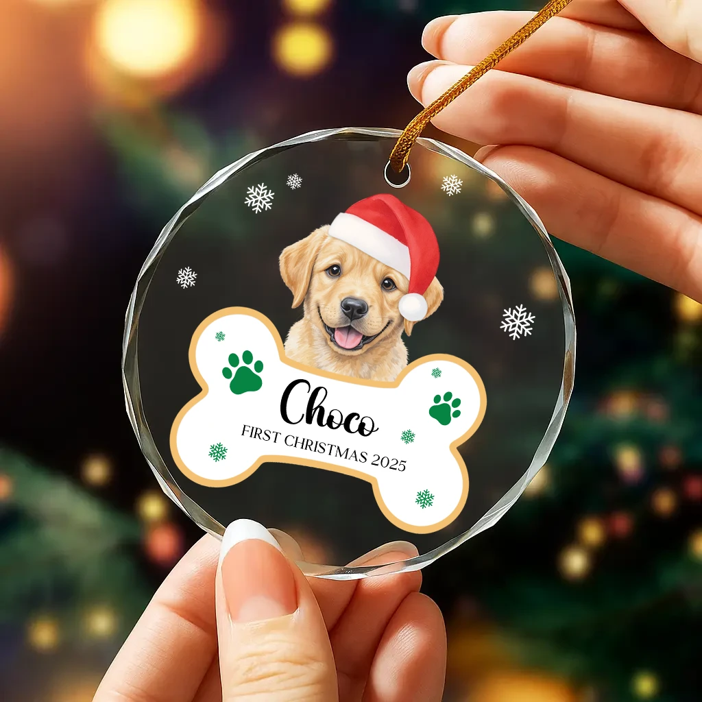 First Christmas Dog Bone Shape Glass Ornament | Personalized Pet Name & Year | Watercolor Style With New Design 2025