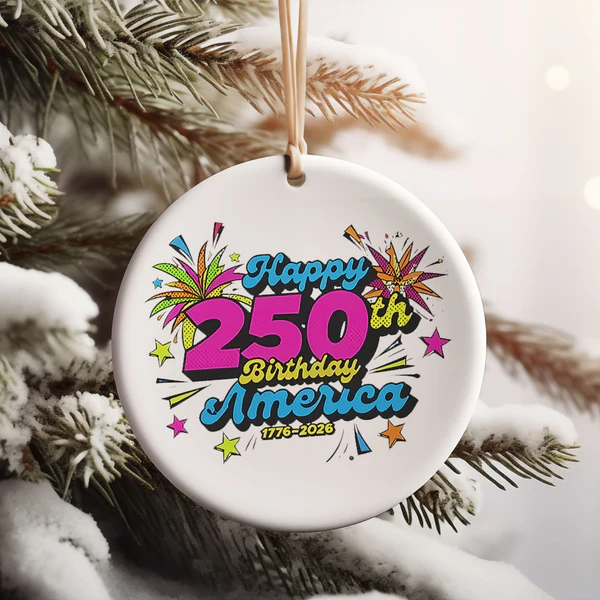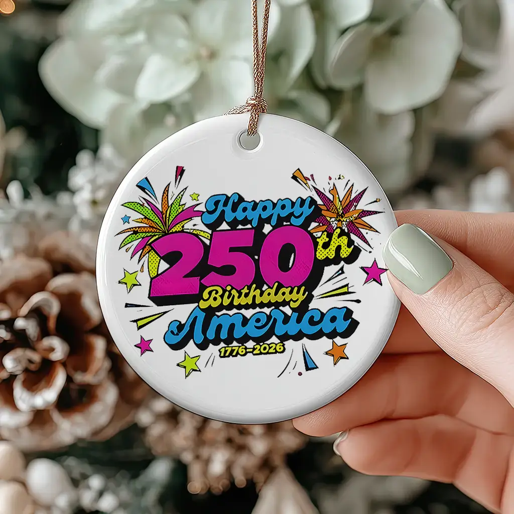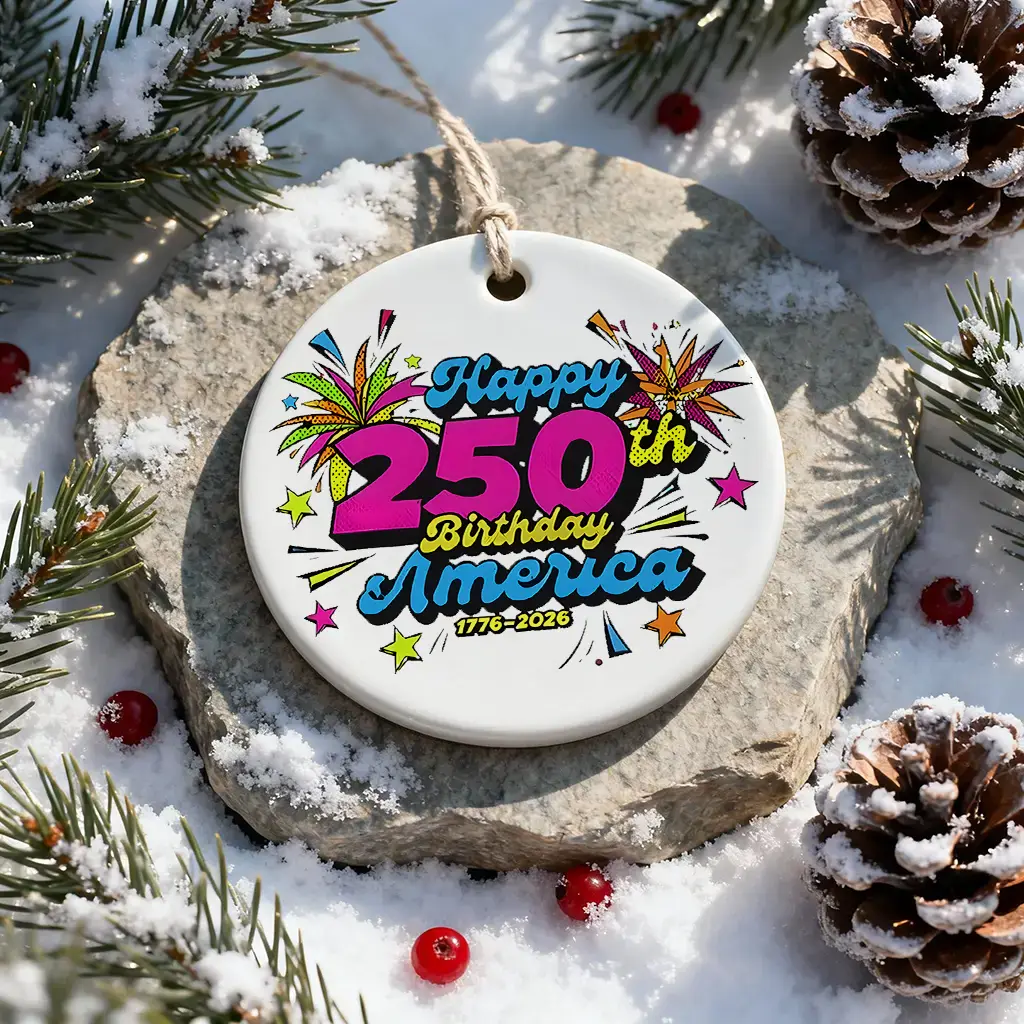 Happy 250th Birthday America Ornament (1776-2026) | Modern Pop Art Ceramic Keepsake | USA Semiquincentennial Party Decor