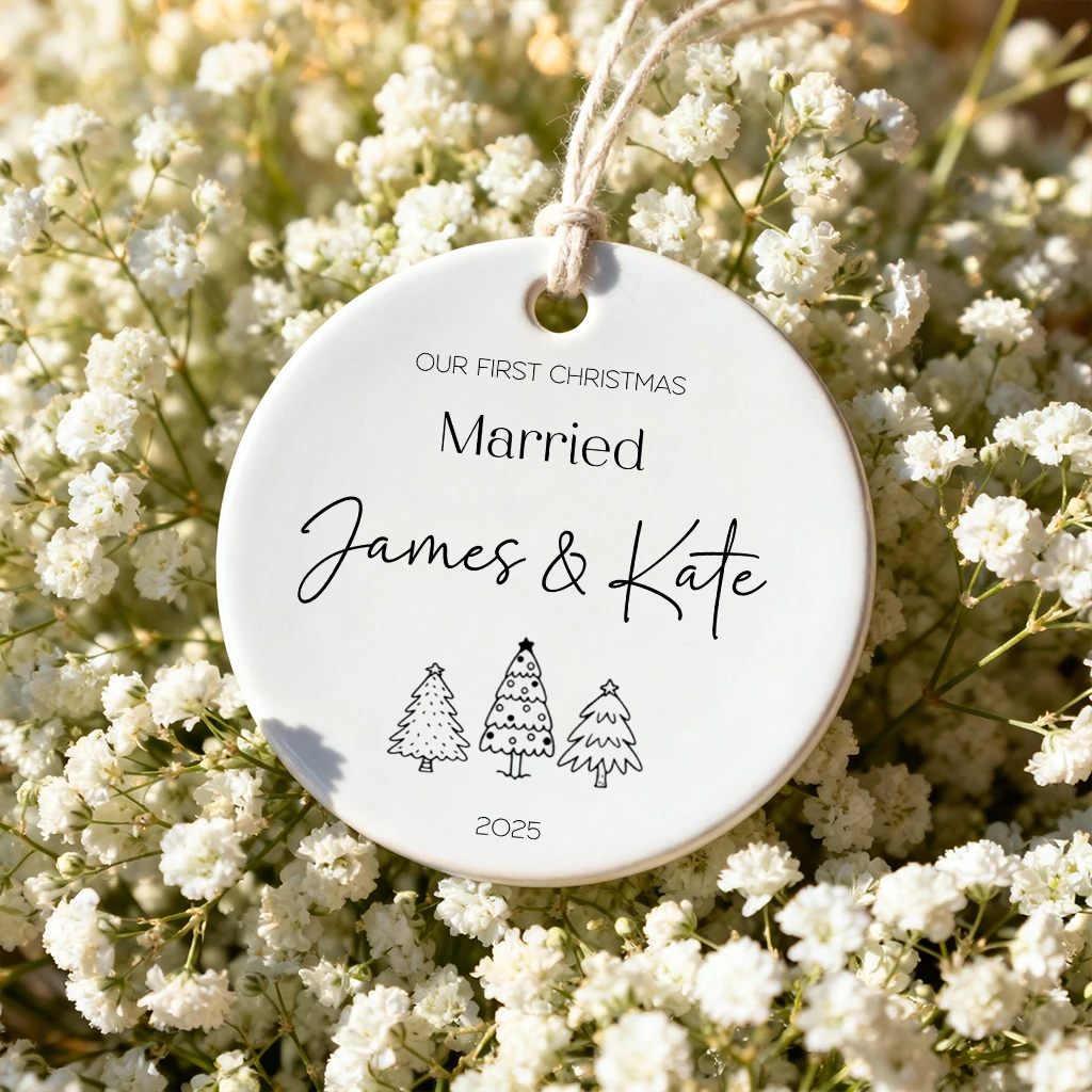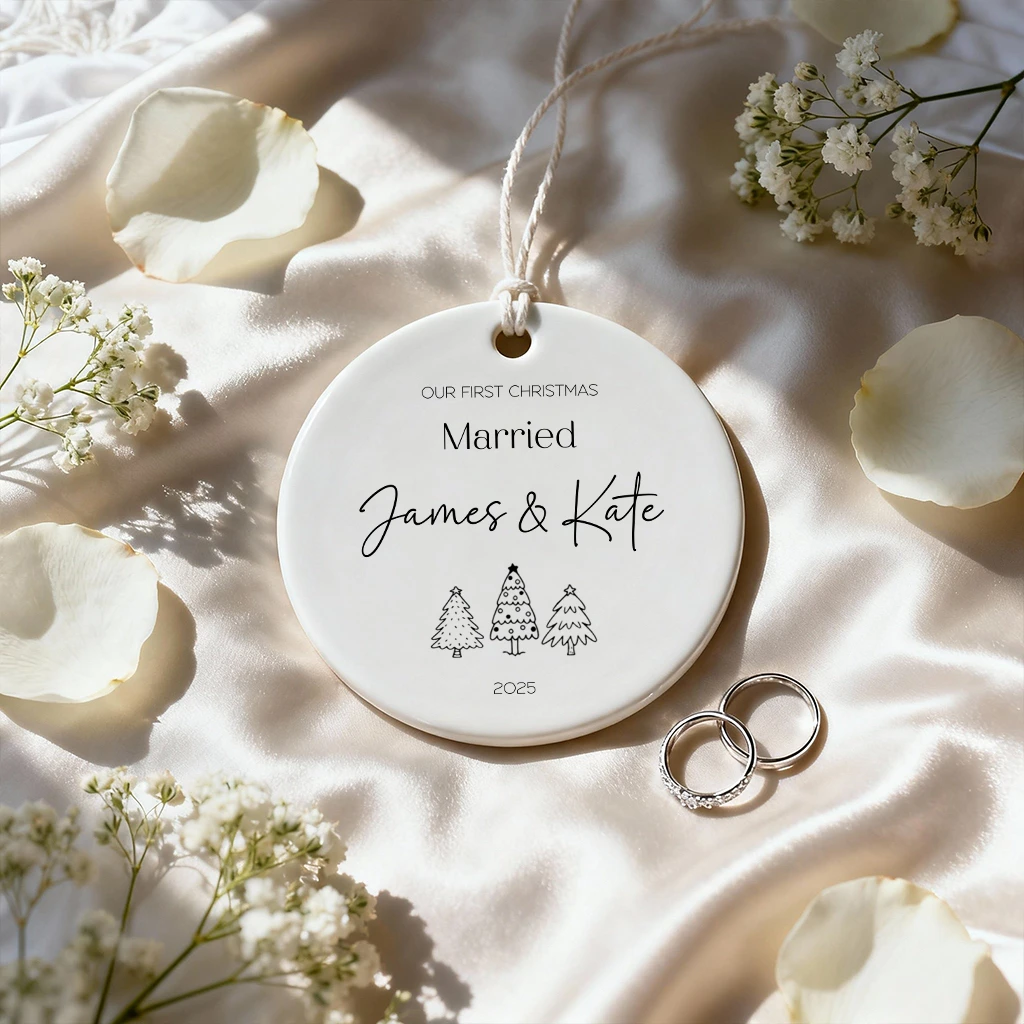 Modern Script First Christmas Ornament | Custom Name & Year Ceramic Decor | Simple Wedding Gift for Couple