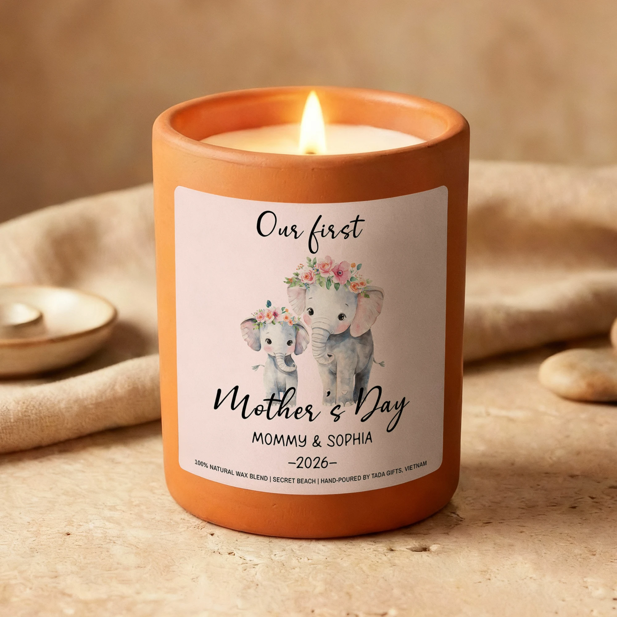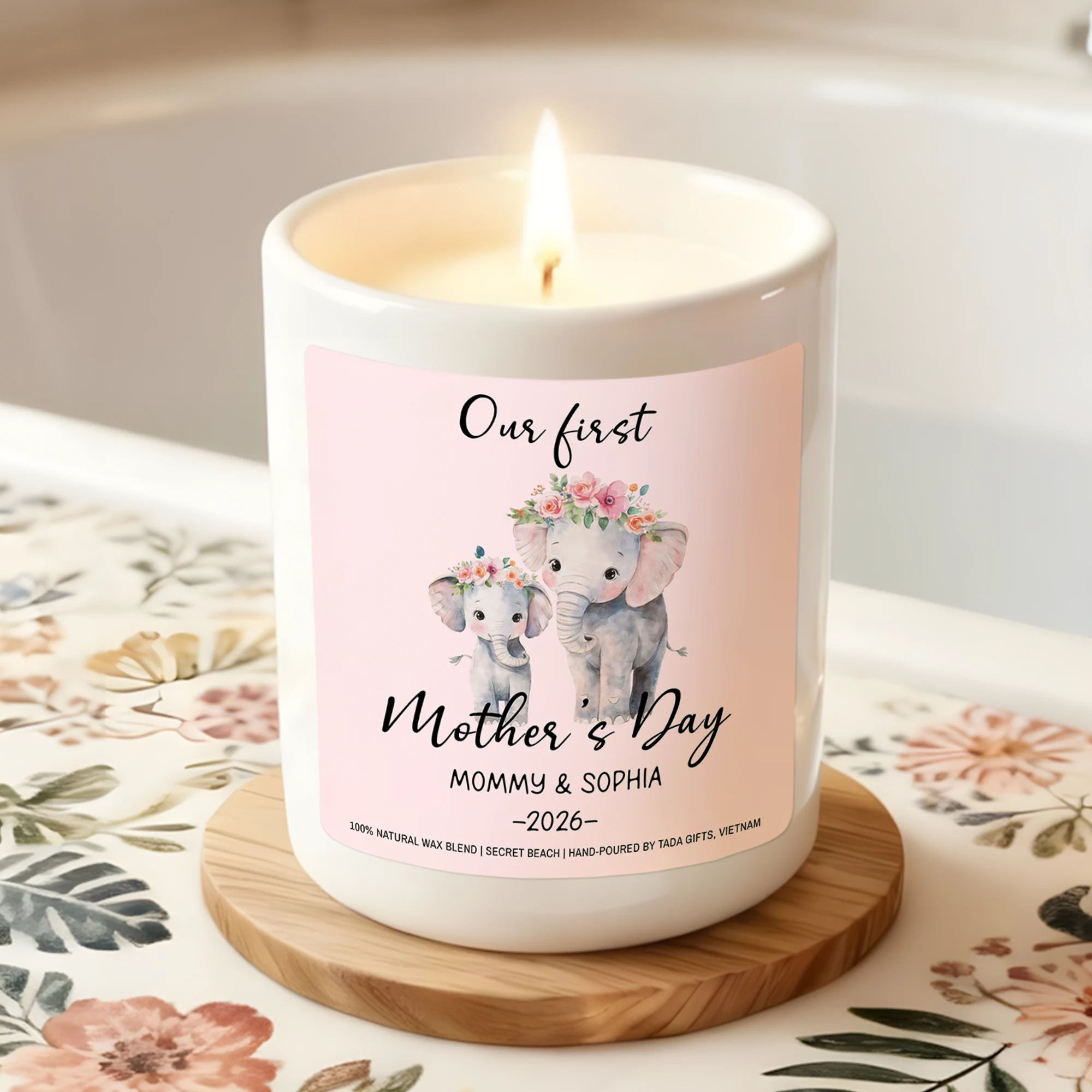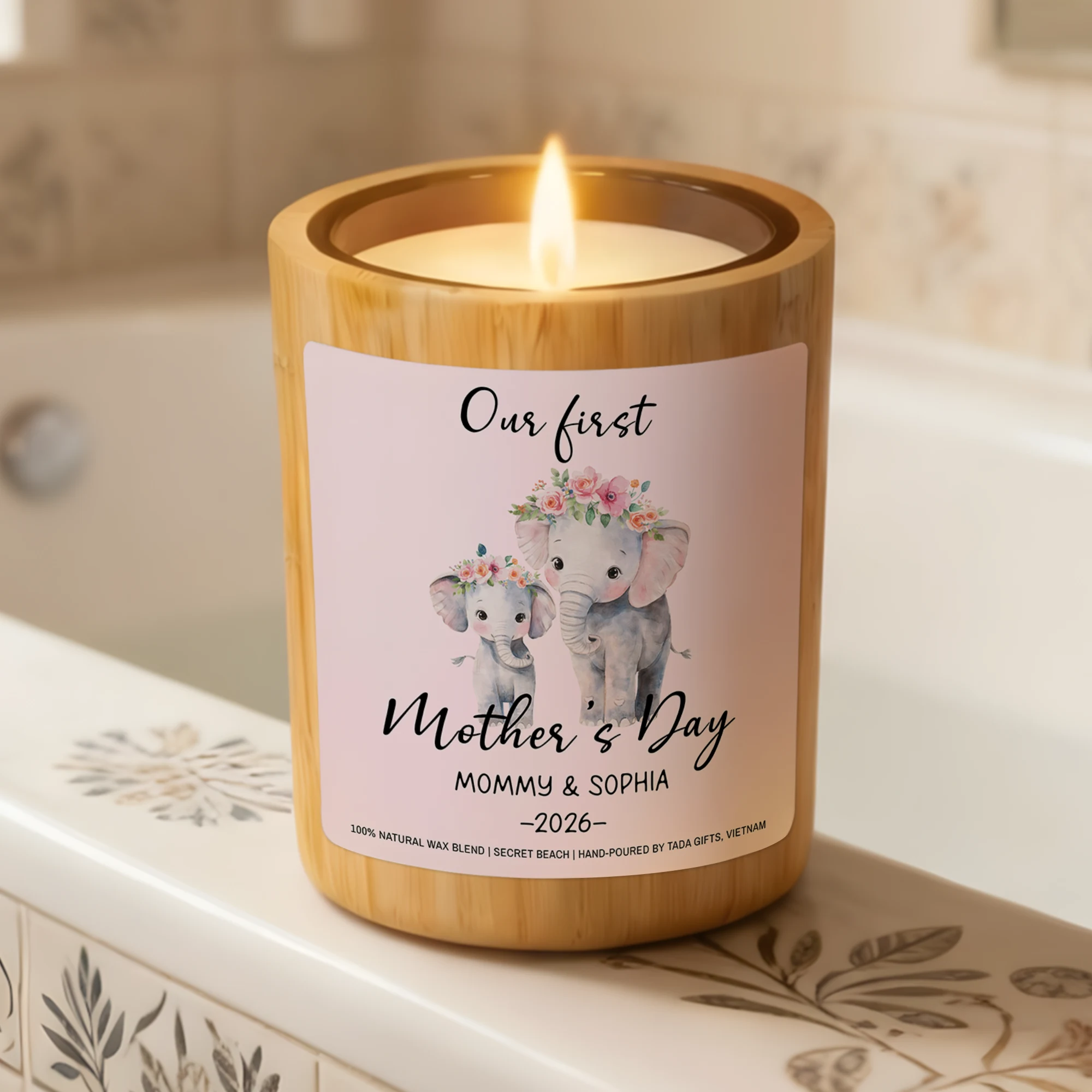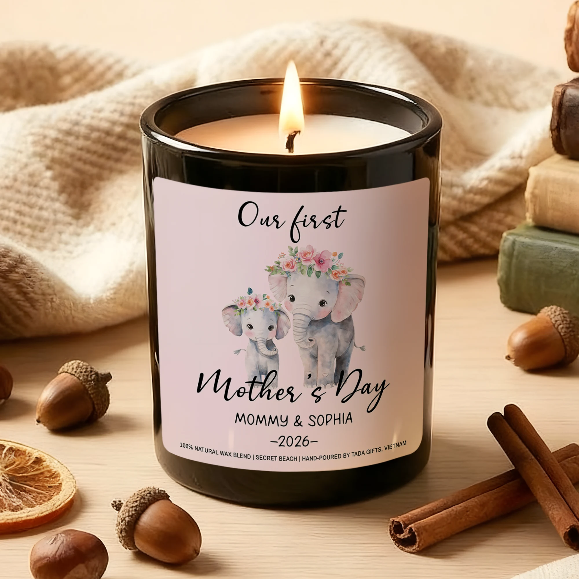 Our First Mother’s Day Candle, Elephant Design, New Mom Gift, Secret Beach Scent