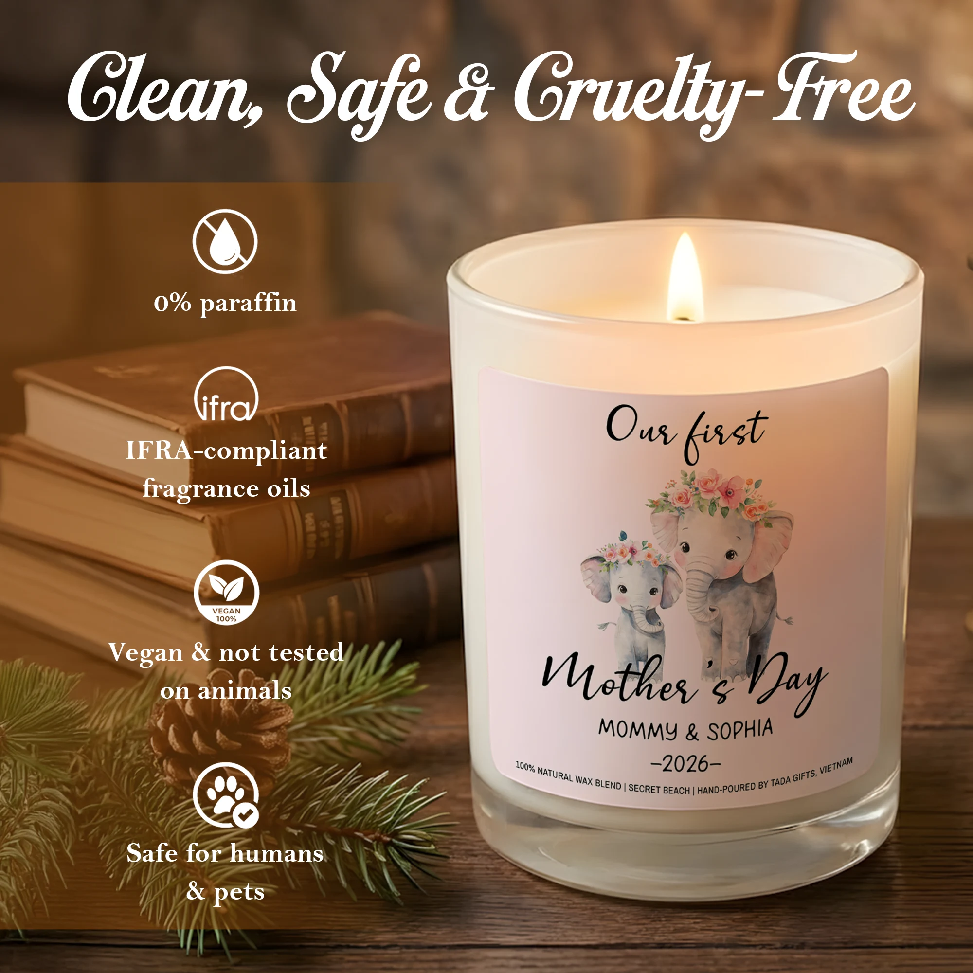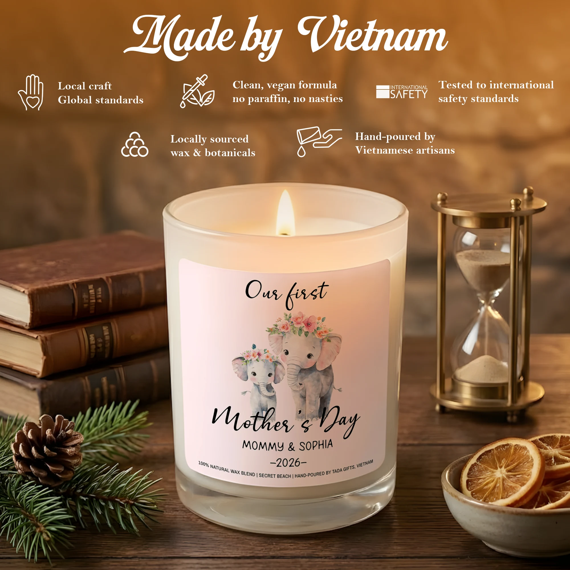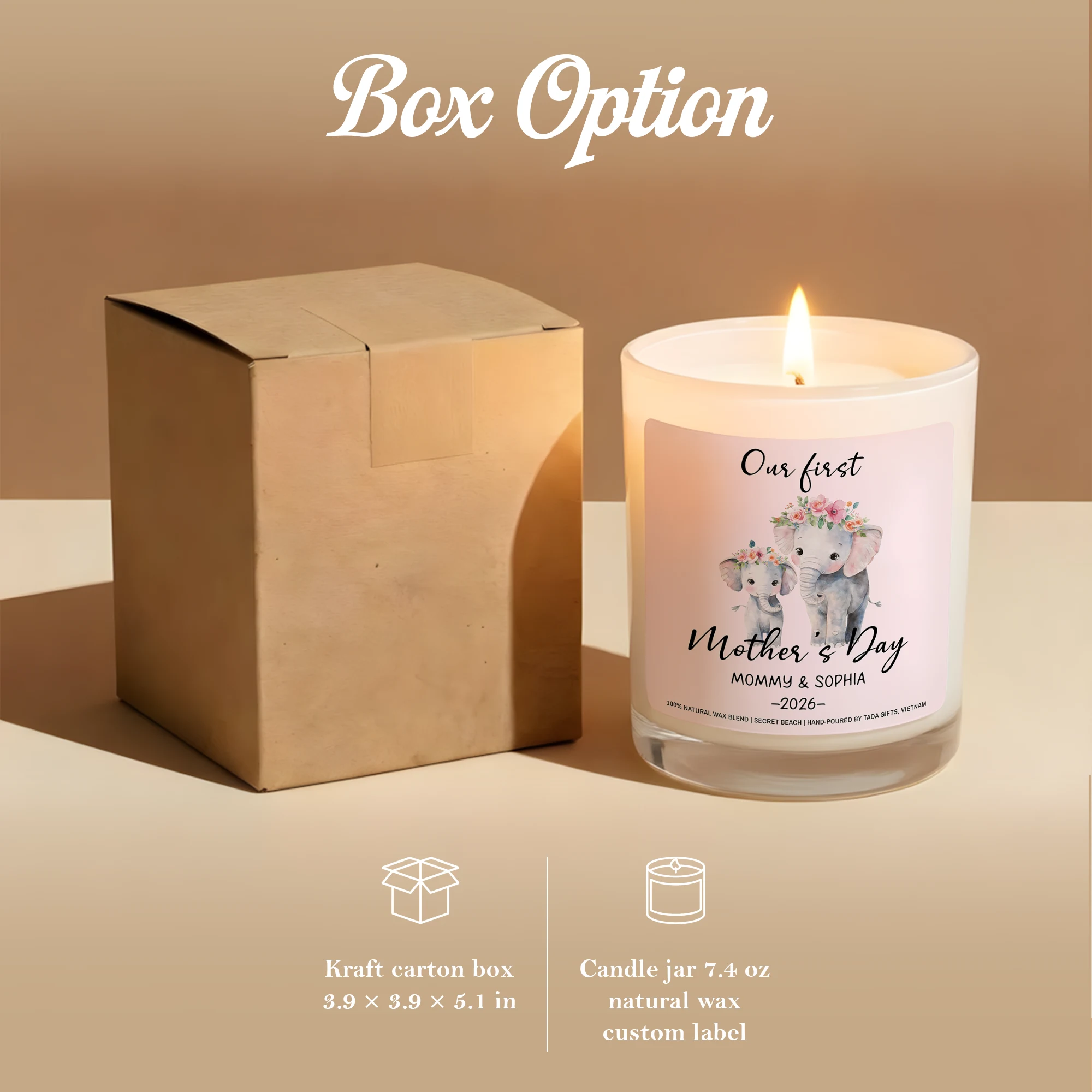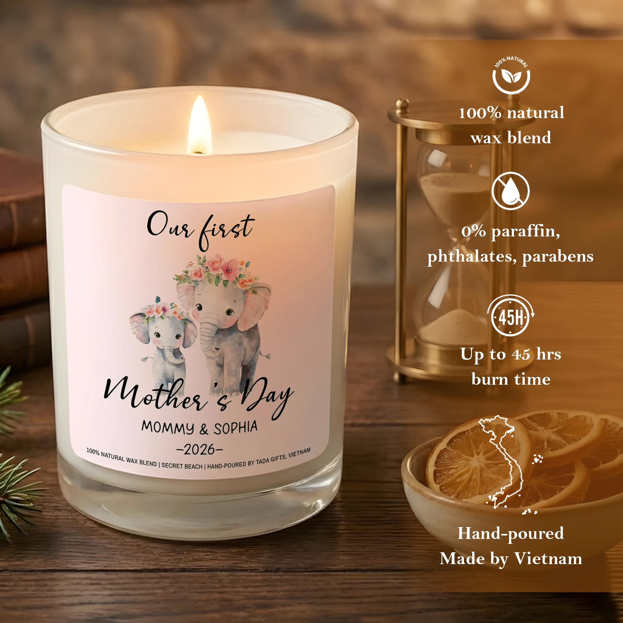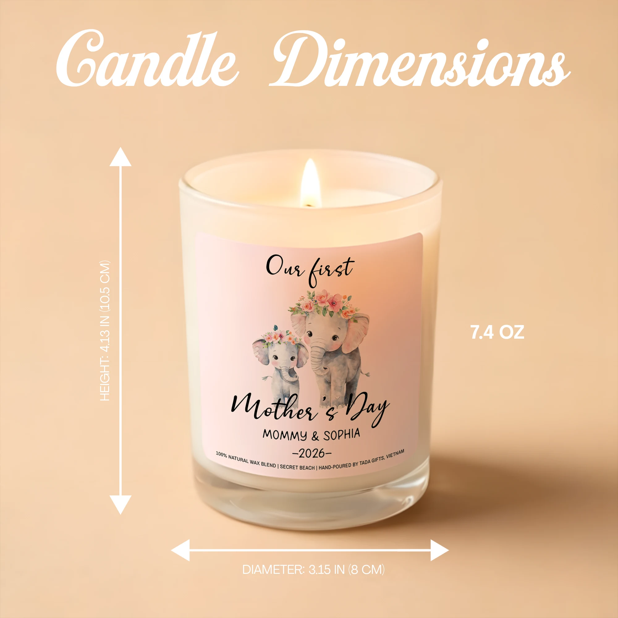 Our First Mother’s Day Candle, Elephant Design, New Mom Gift, Secret Beach Scent