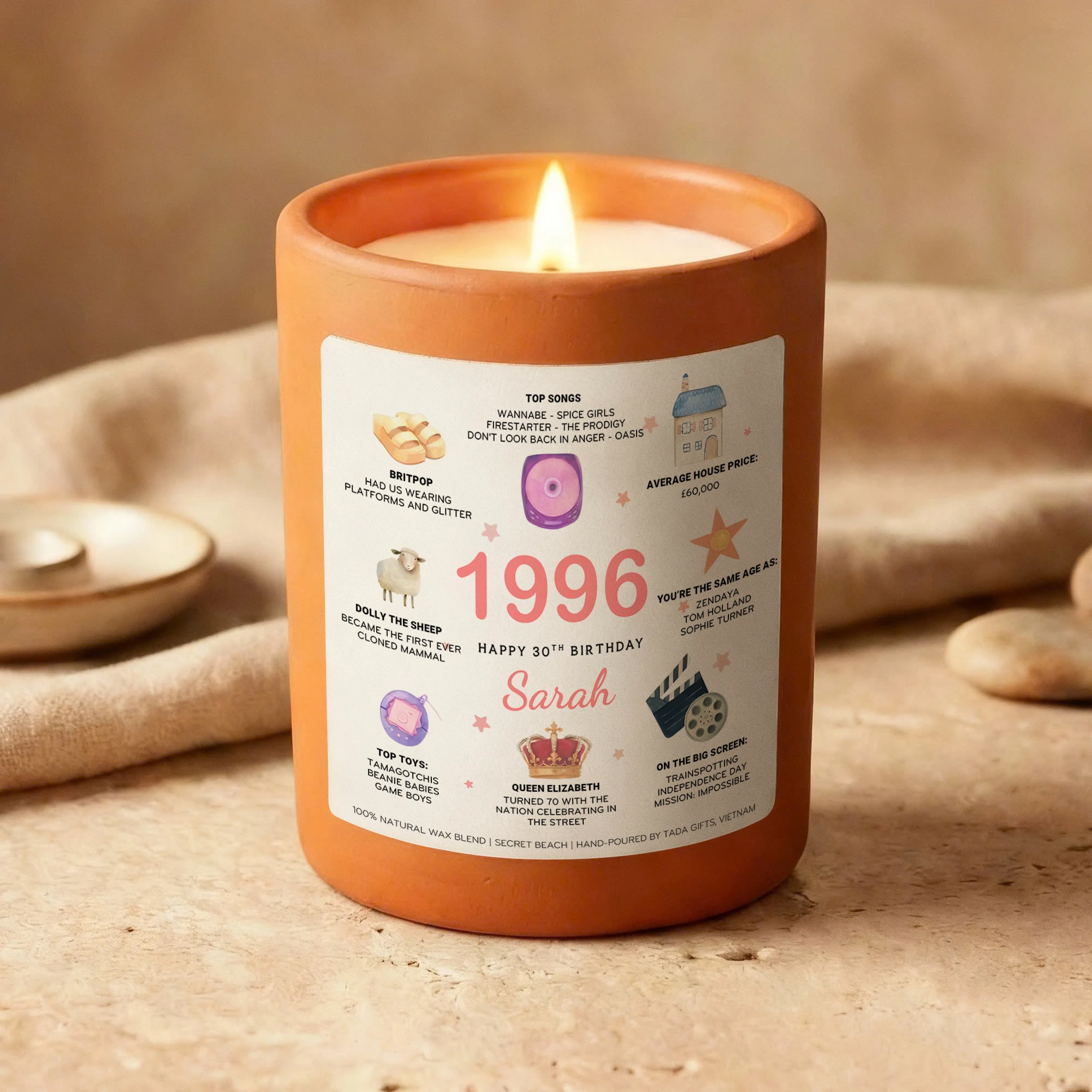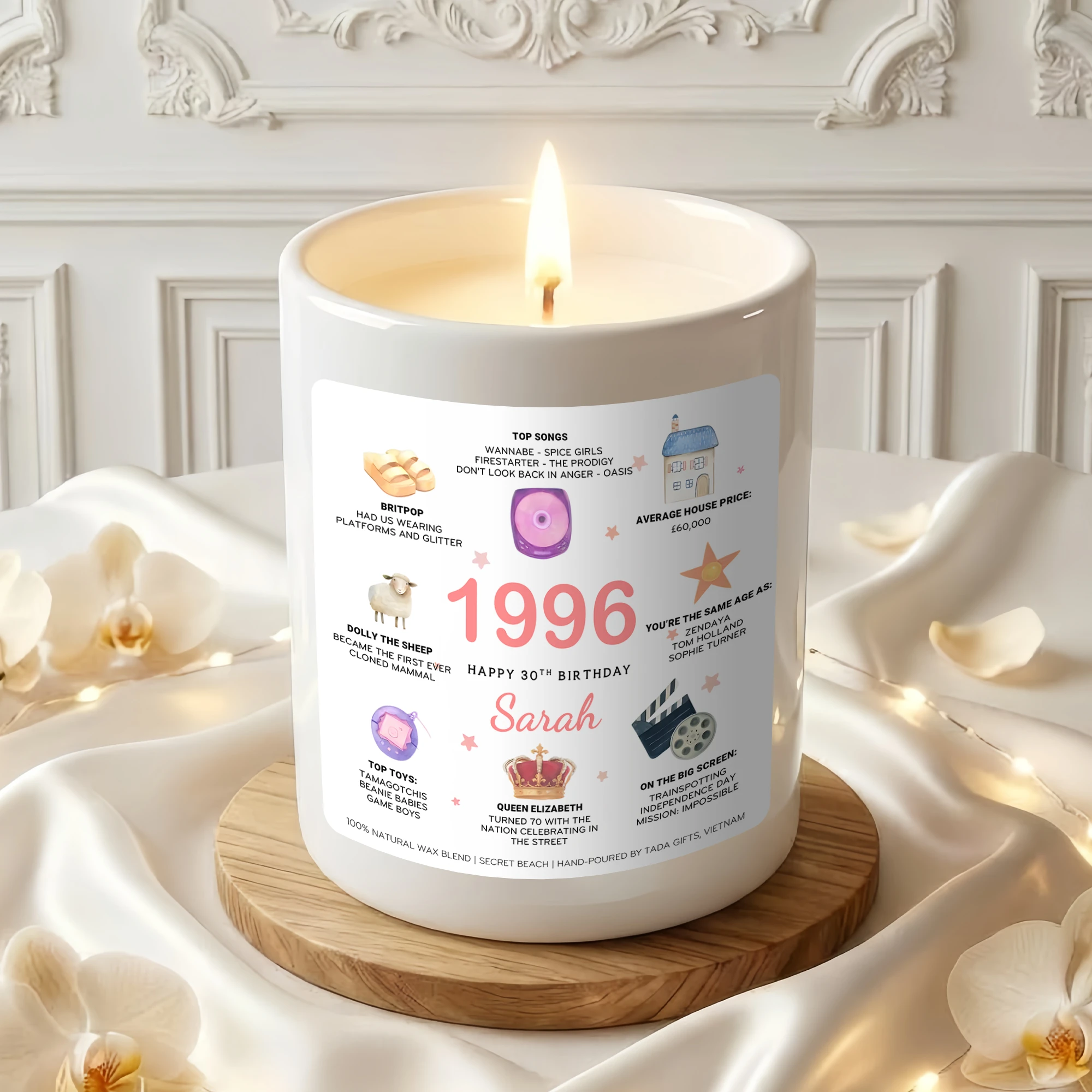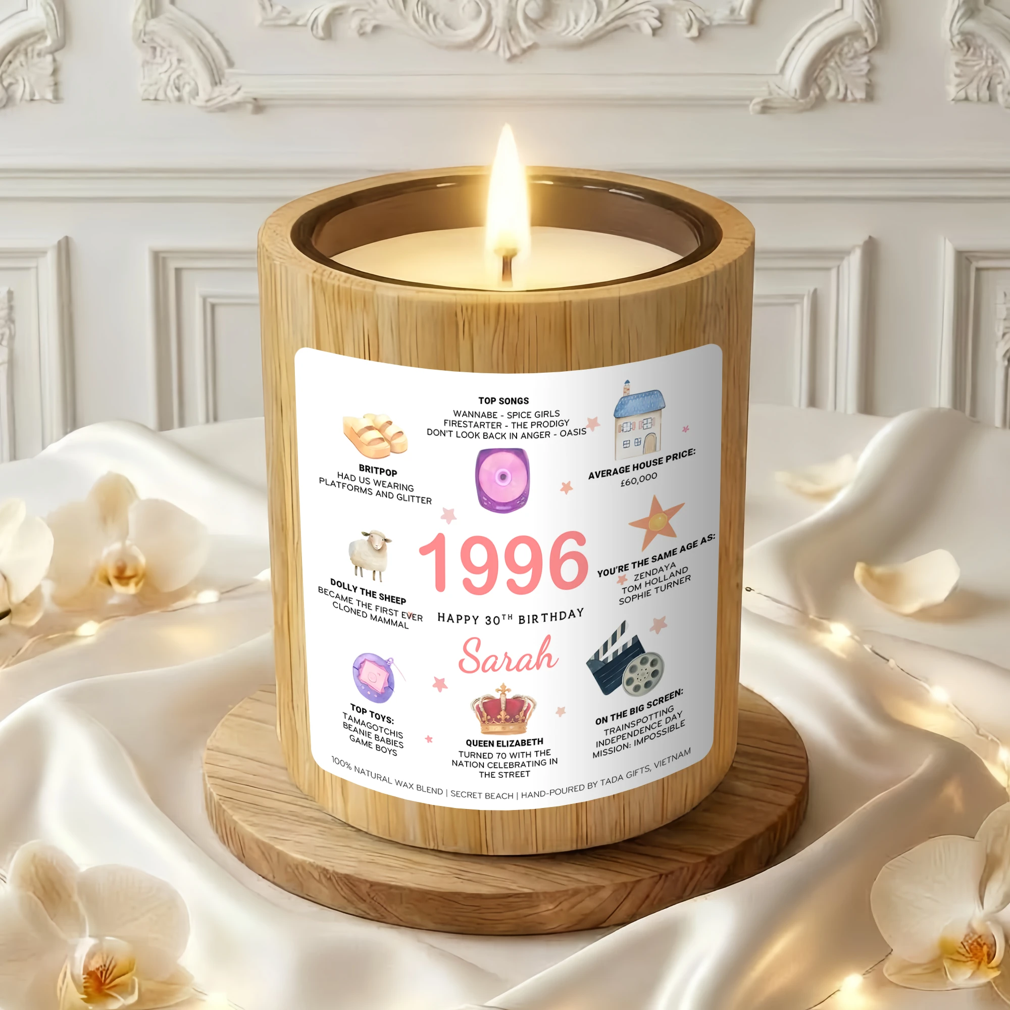 Personalized 1996 Birthday Candle – 30th Birthday Gift for Her – Custom Name Birthday Facts Candle – Born in 1996 Gift