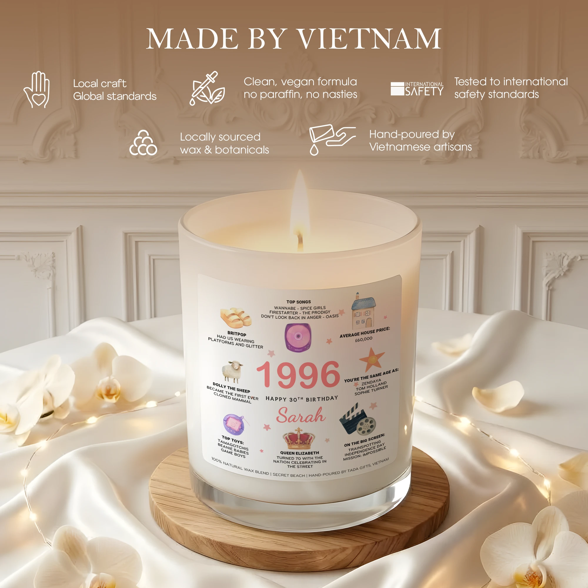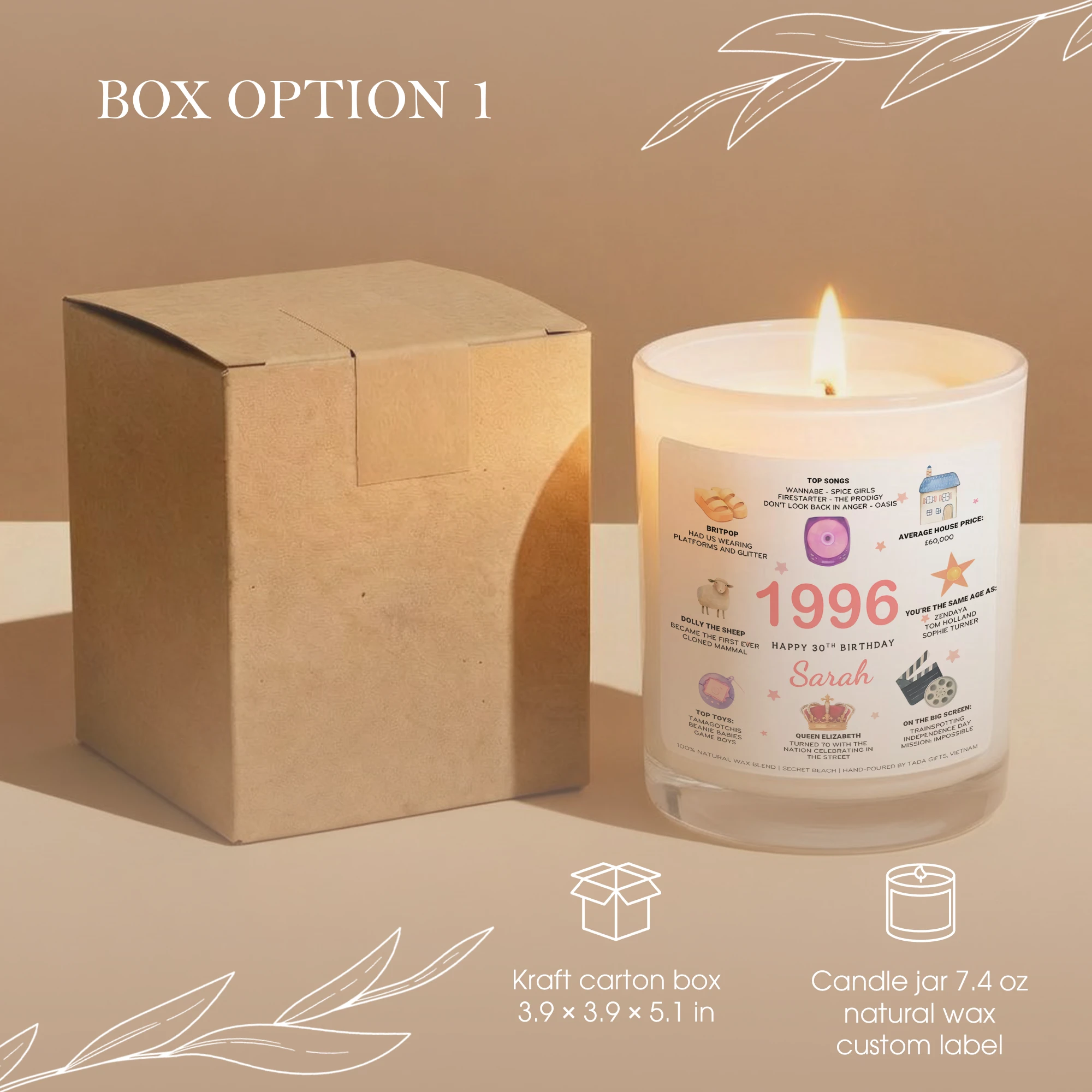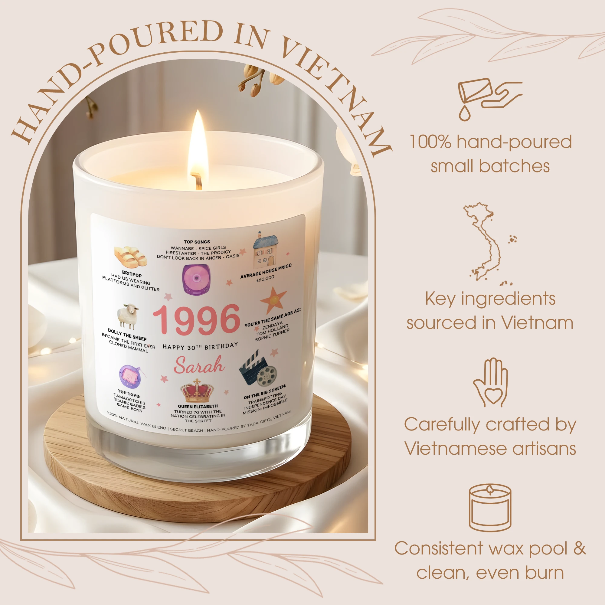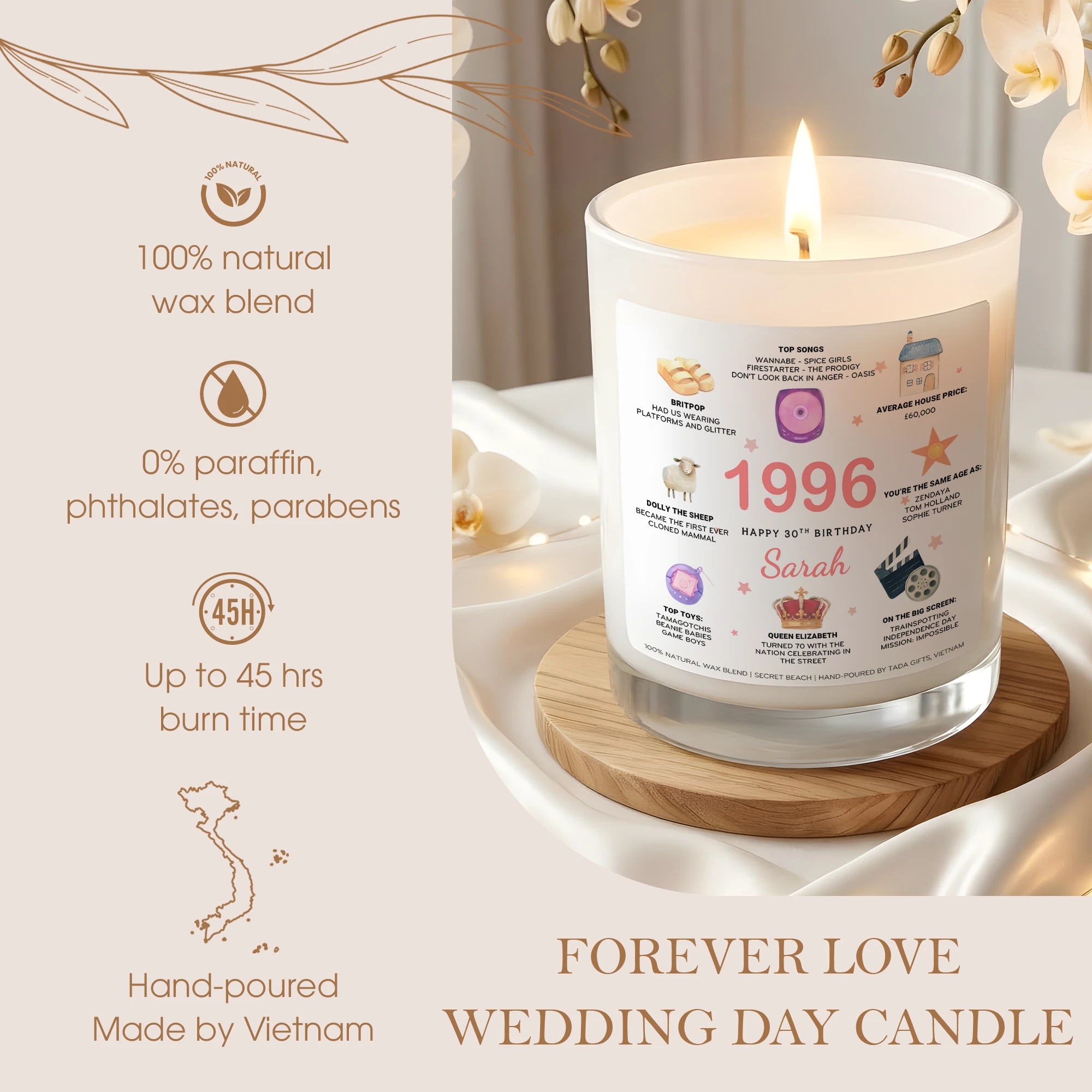 Personalized 1996 Birthday Candle – 30th Birthday Gift for Her – Custom Name Birthday Facts Candle – Born in 1996 Gift