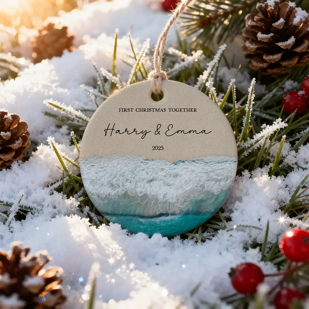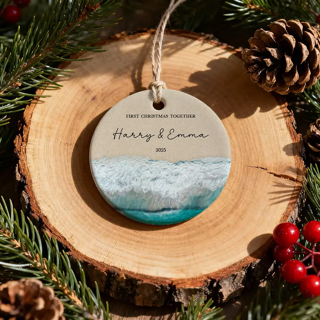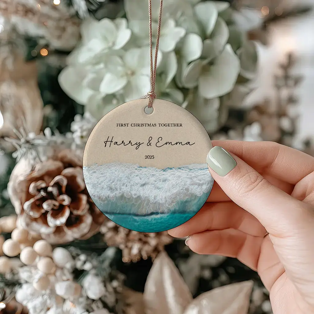Personalized Beach Ornament 2025, Our First Christmas Together Keepsake, Ocean Waves Couple Gift, Tropical Christmas Decor