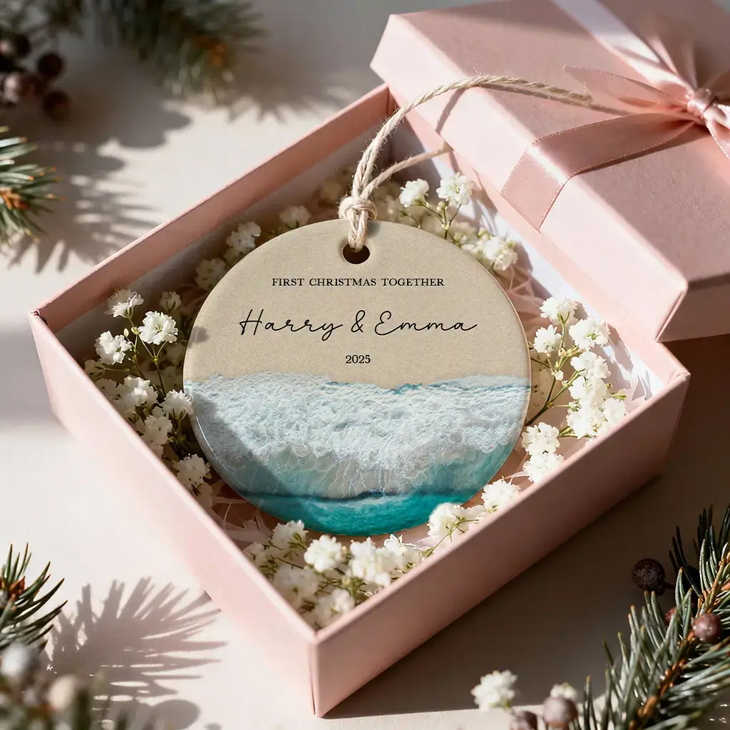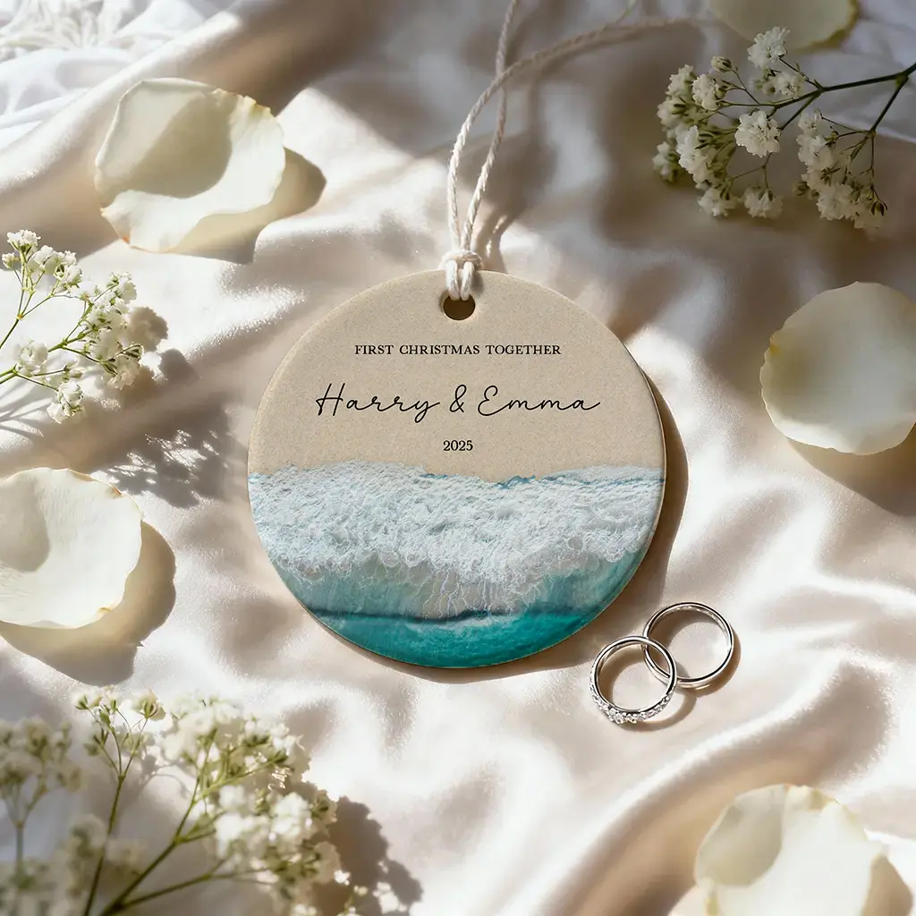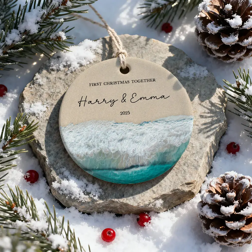 Personalized Beach Ornament 2025, Our First Christmas Together Keepsake, Ocean Waves Couple Gift, Tropical Christmas Decor