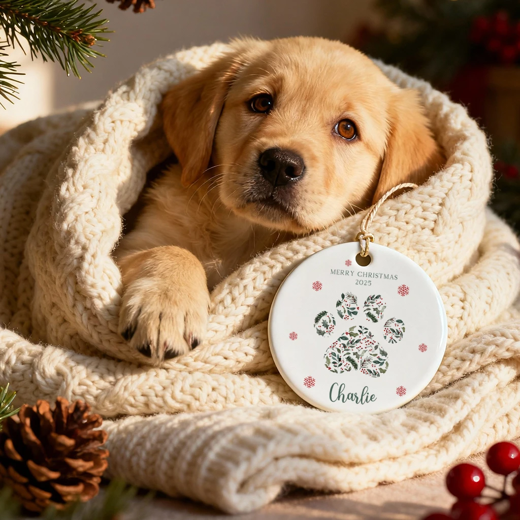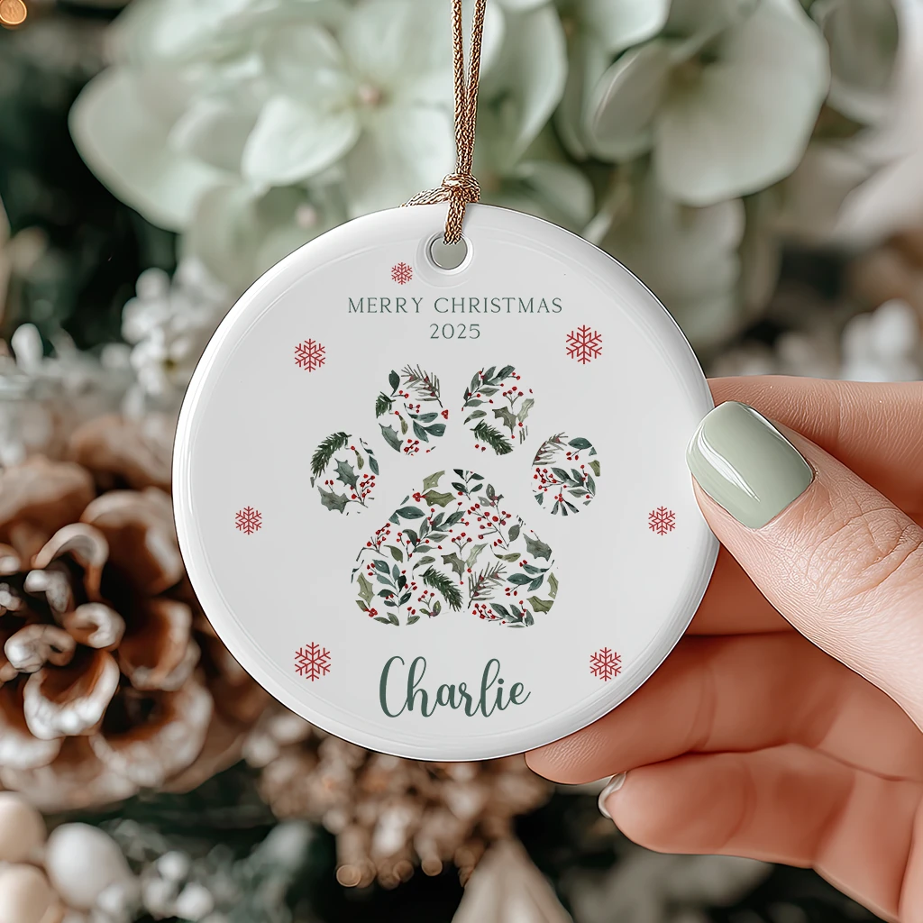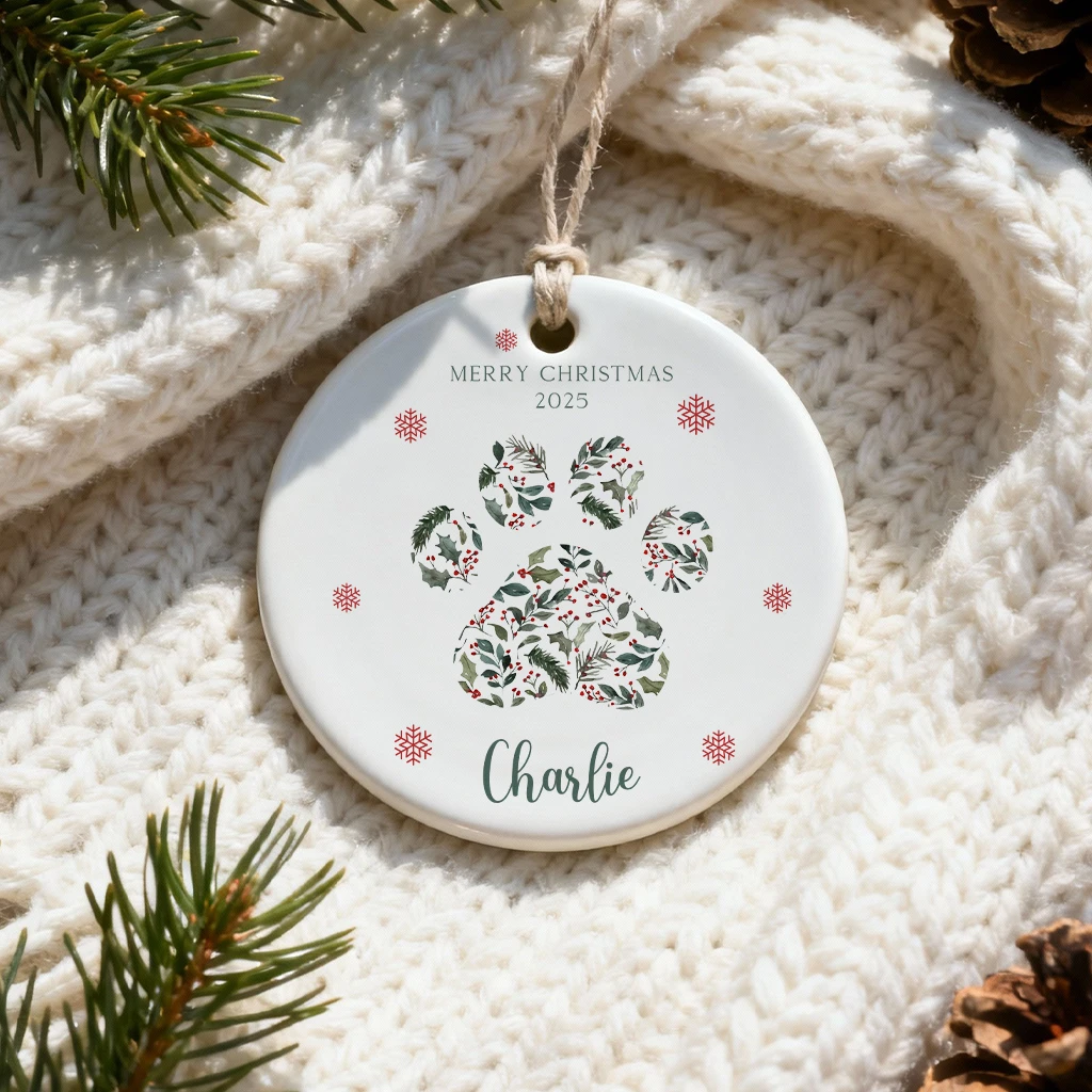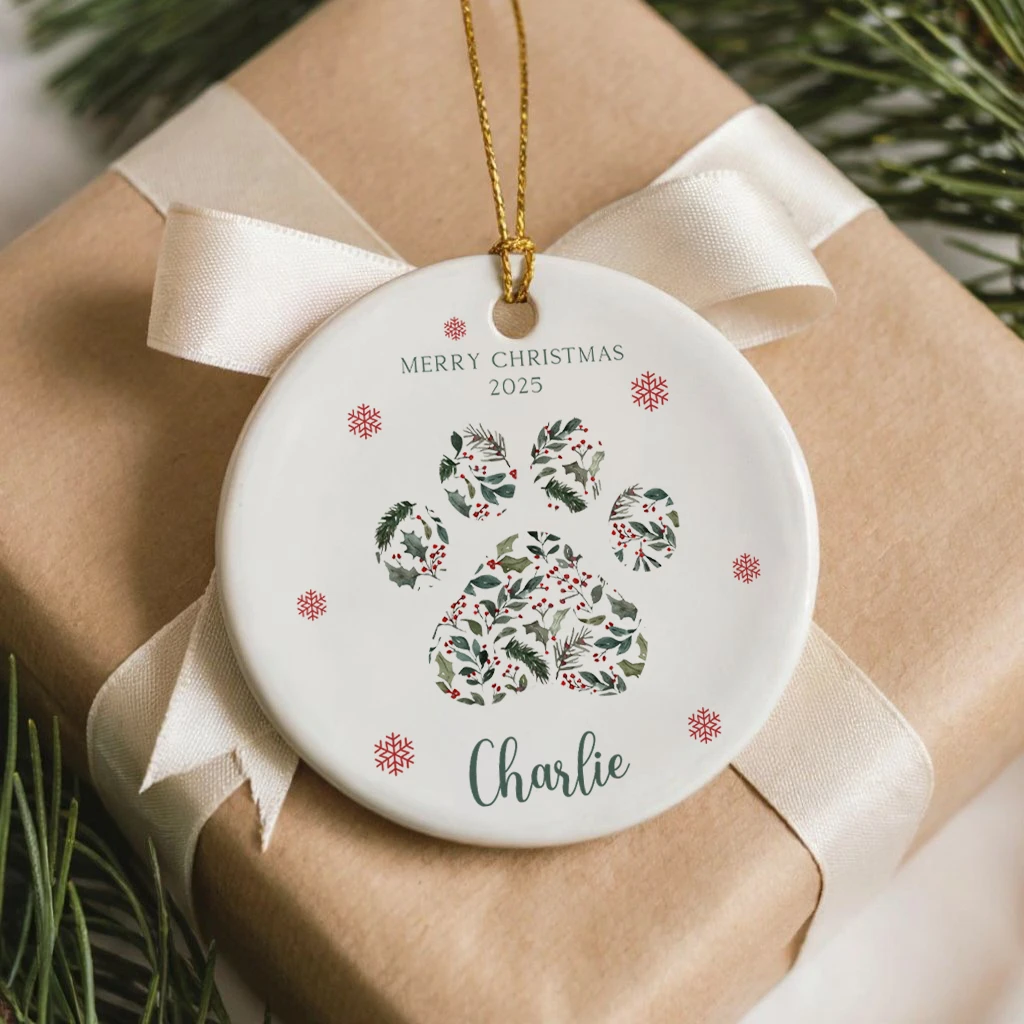 Personalized Ceramic Cat Paw Print Christmas Ornament Custom Name | Cat Mom Keepsake Gift | Choose Santa Hat or Holly Wreath Style