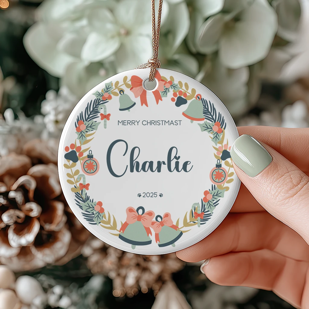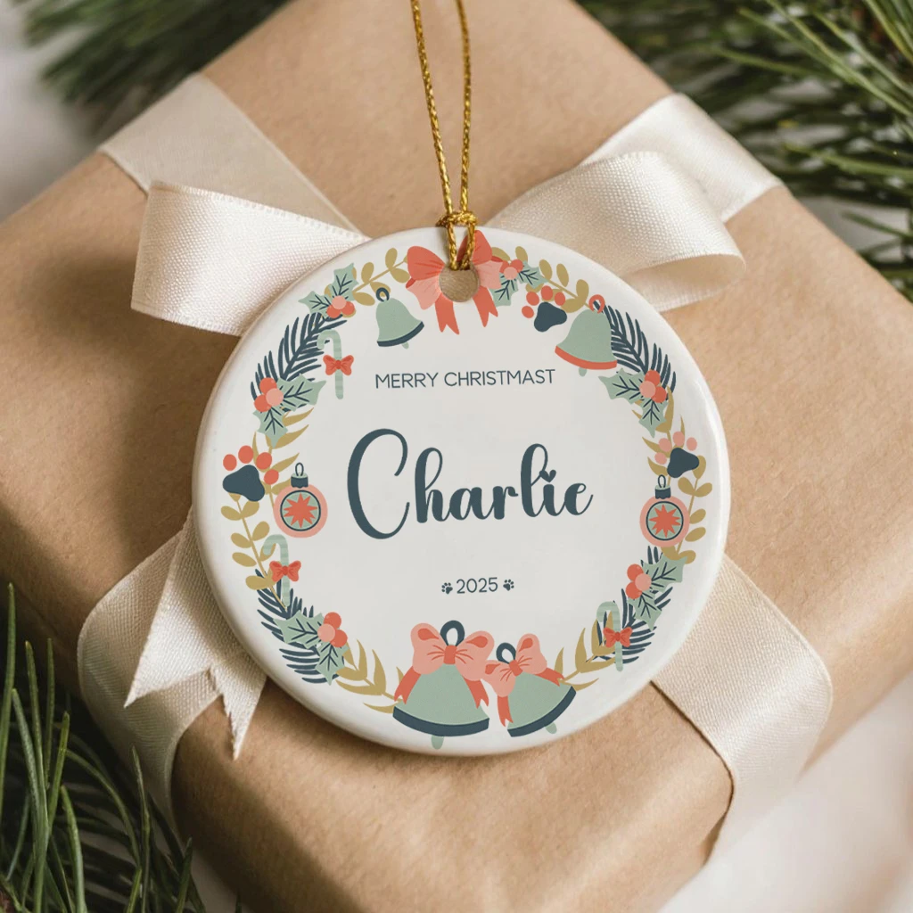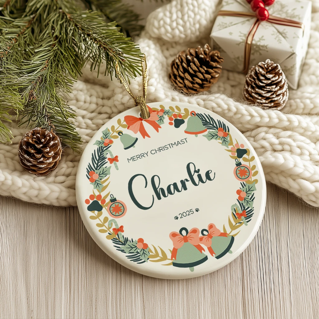 Personalized Dog Name Wreath Ceramic Ornament | Custom Pet Christmas Keepsake for 2025 | Perfect for Dog Lovers