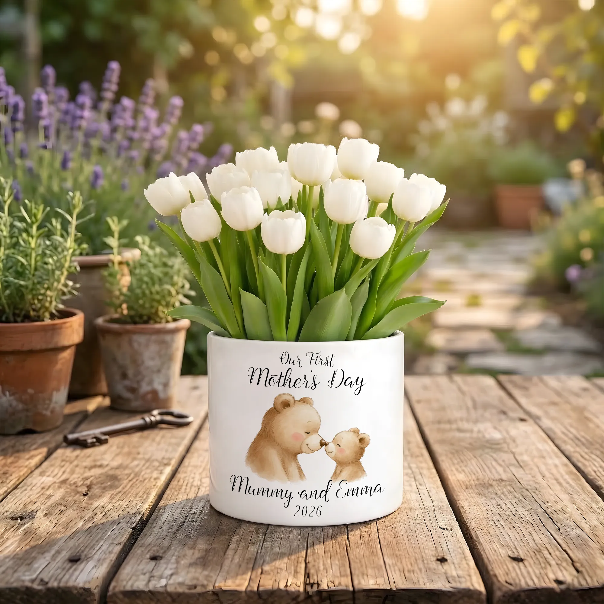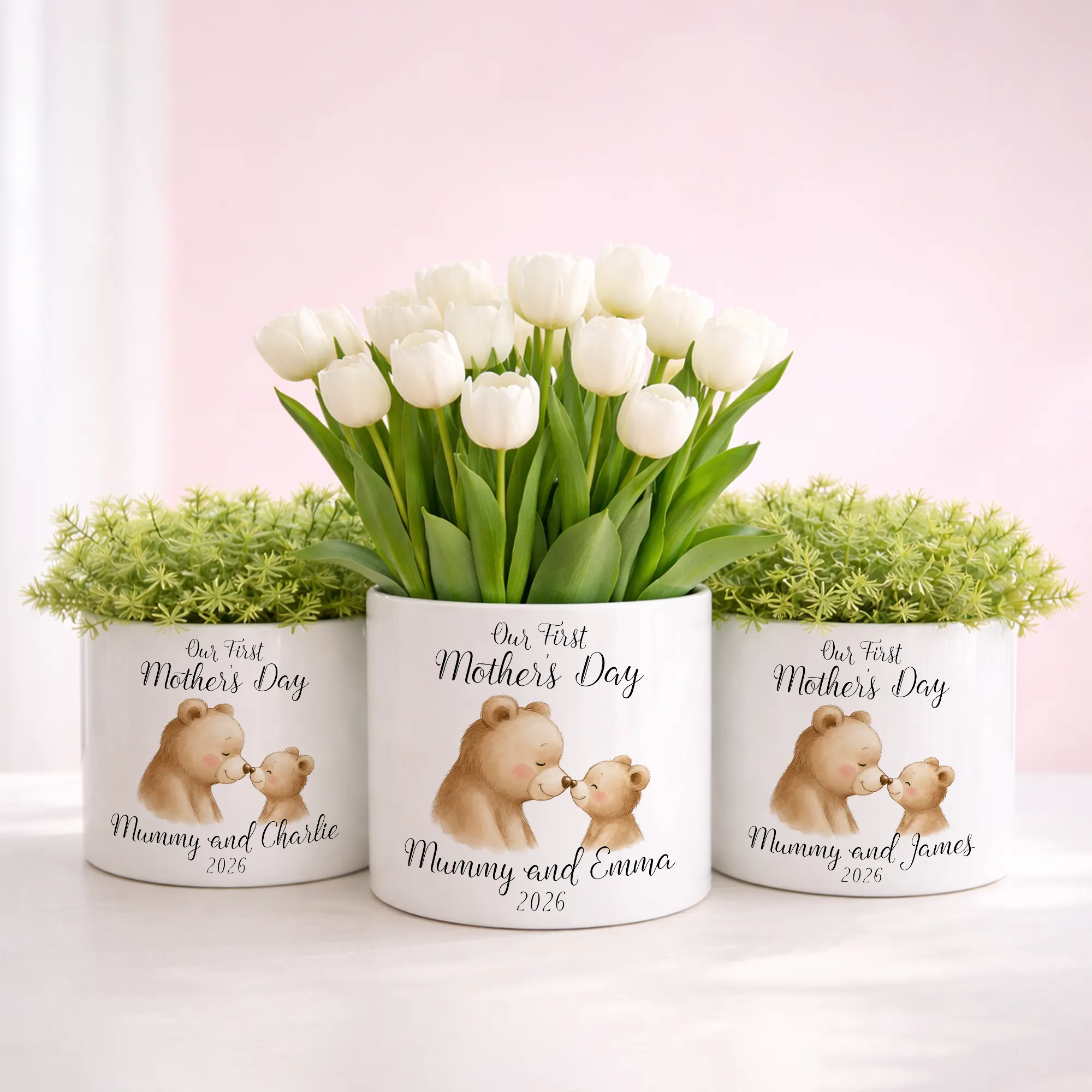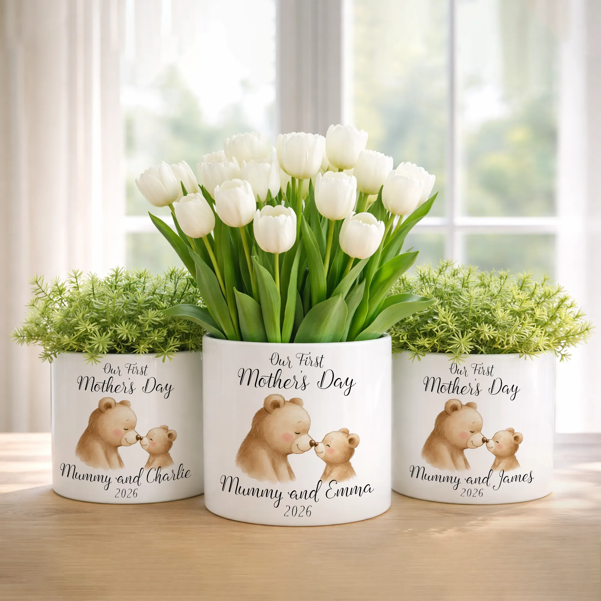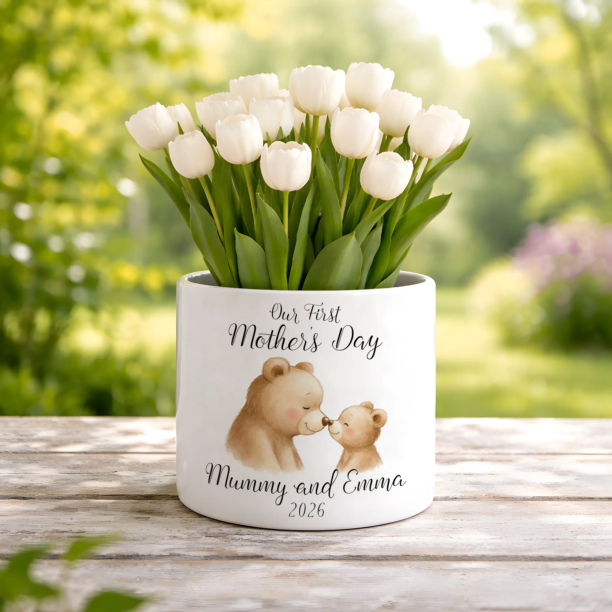 Personalized Flower Vase Gift for Mom, Custom Name Ceramic Planter, Mom and Baby Bear Keepsake, First Mother’s Day Gift, Home Decor Gift