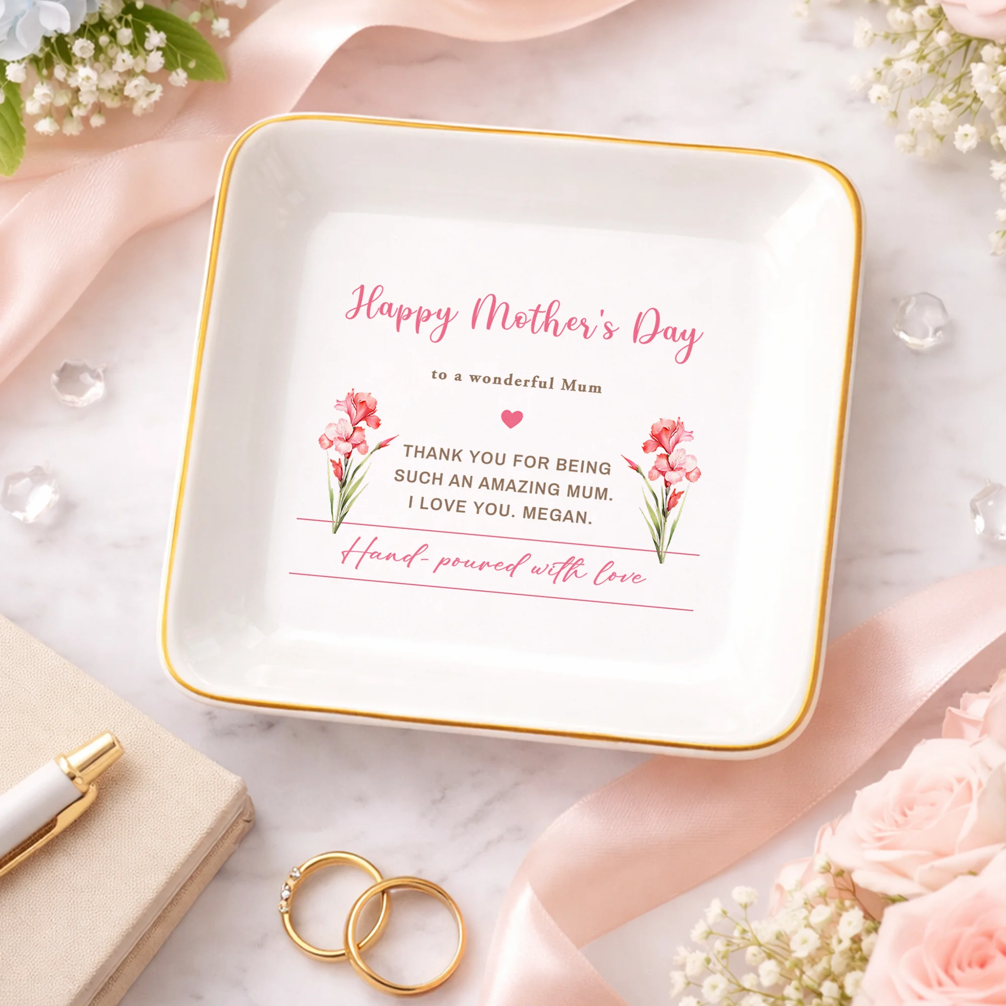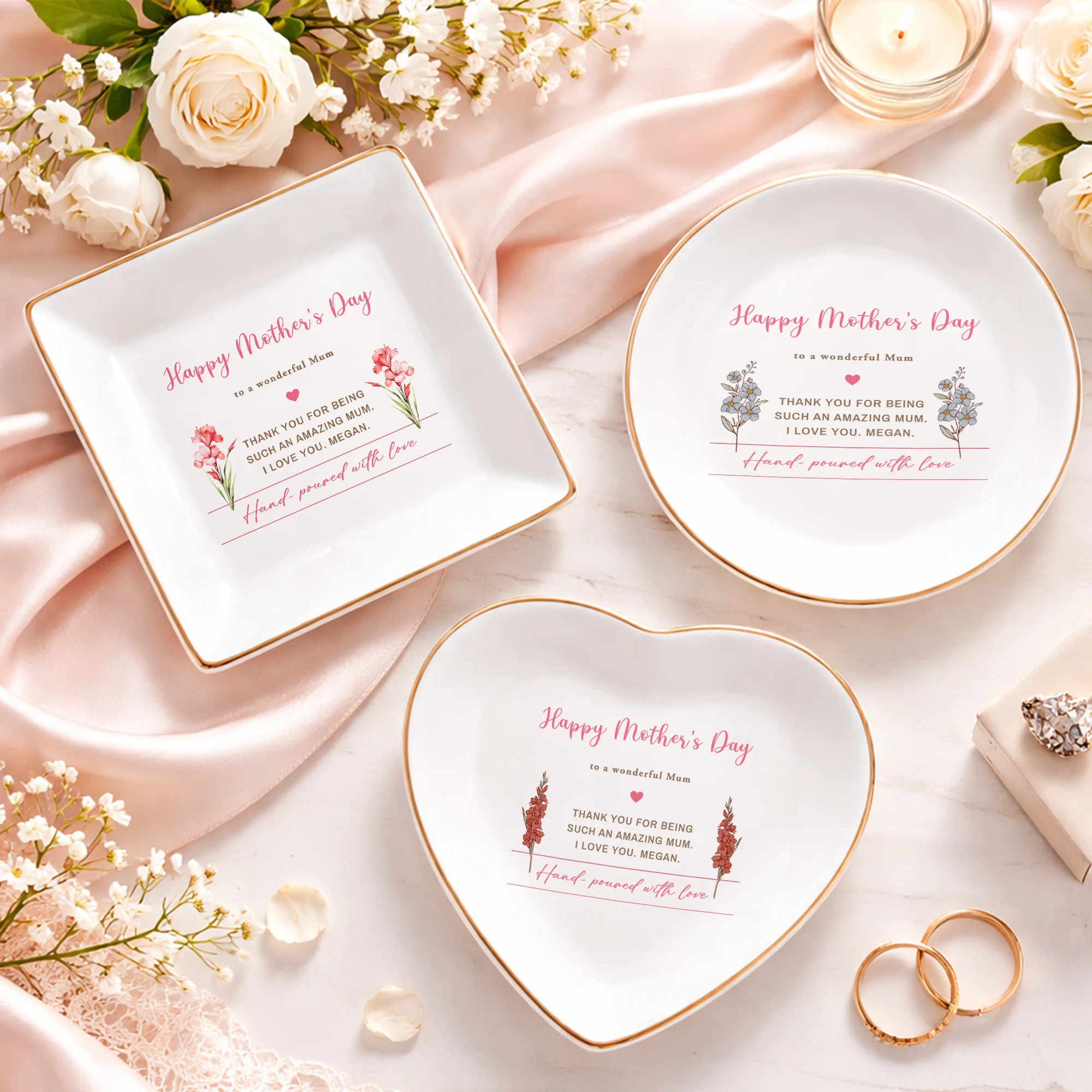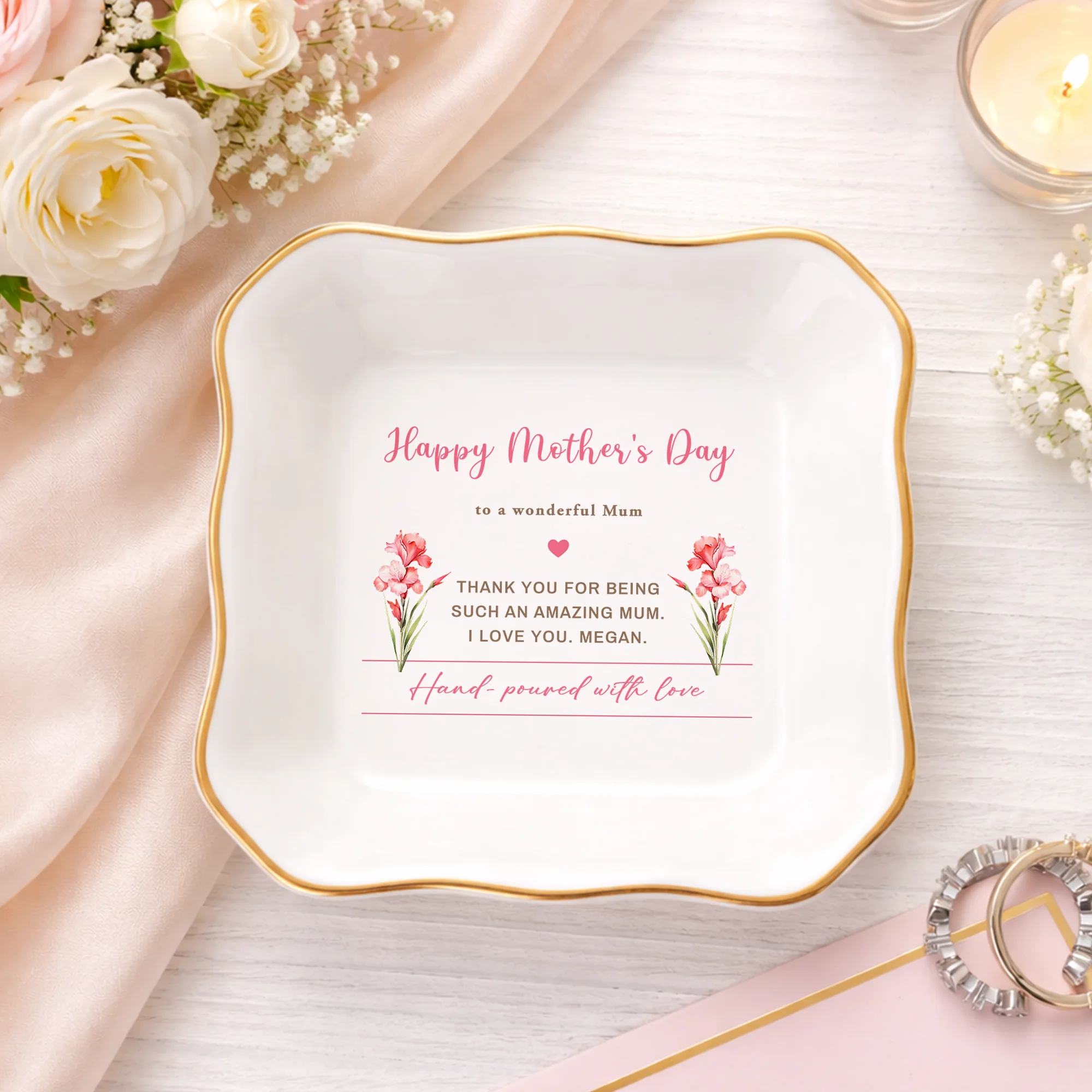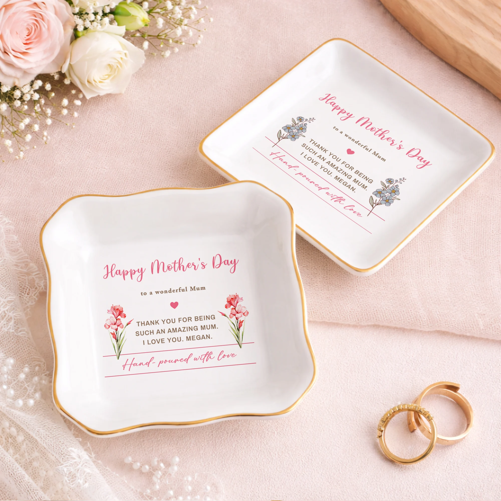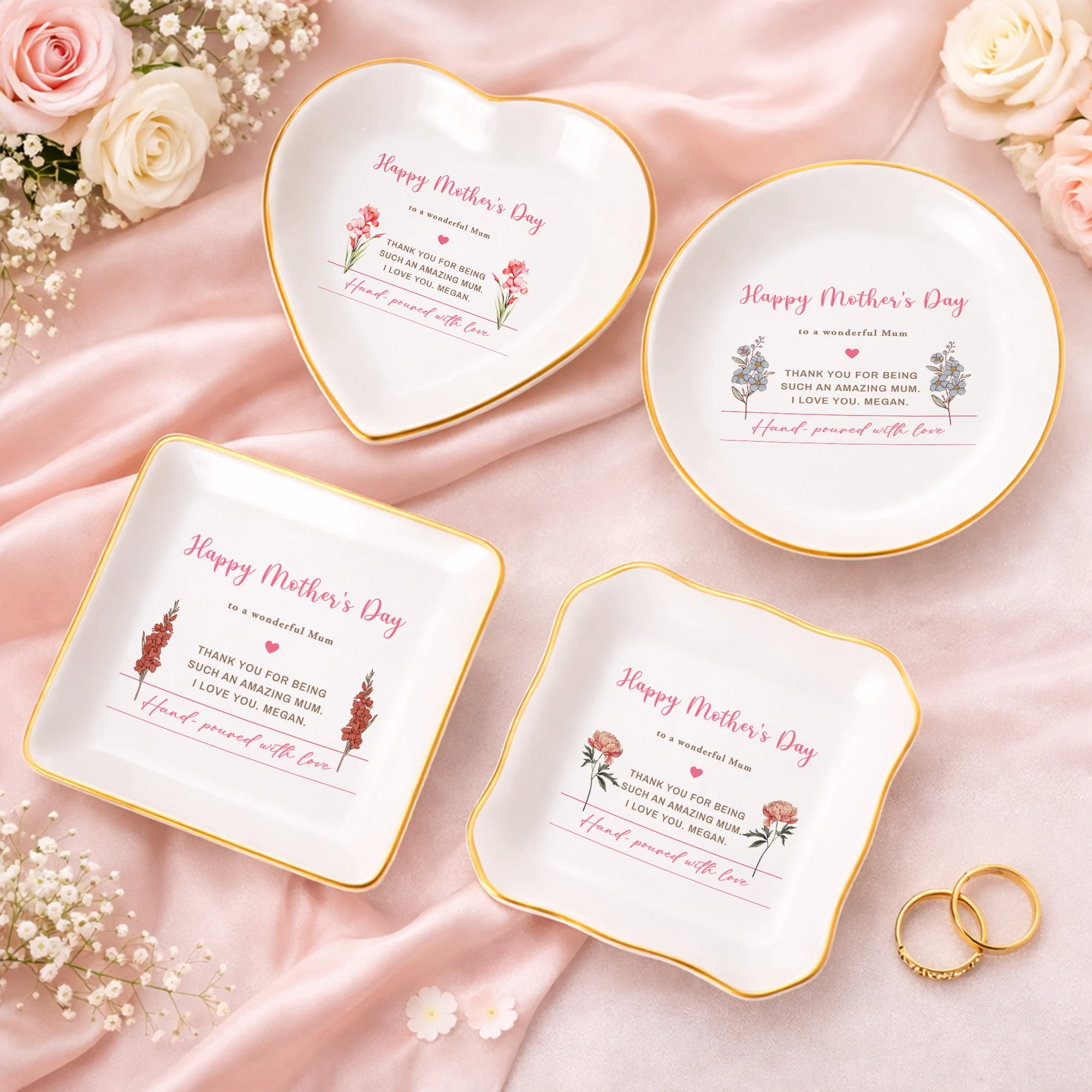 Personalized Mother’s Day Gift for Mom – Custom Jewelry Dish, Birth Flower Trinket Tray, Keepsake Ring Holder, Memorial Gift