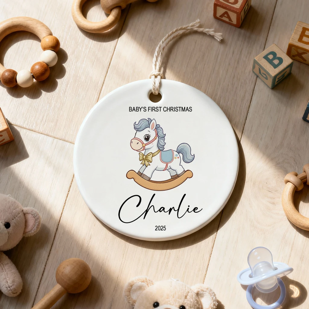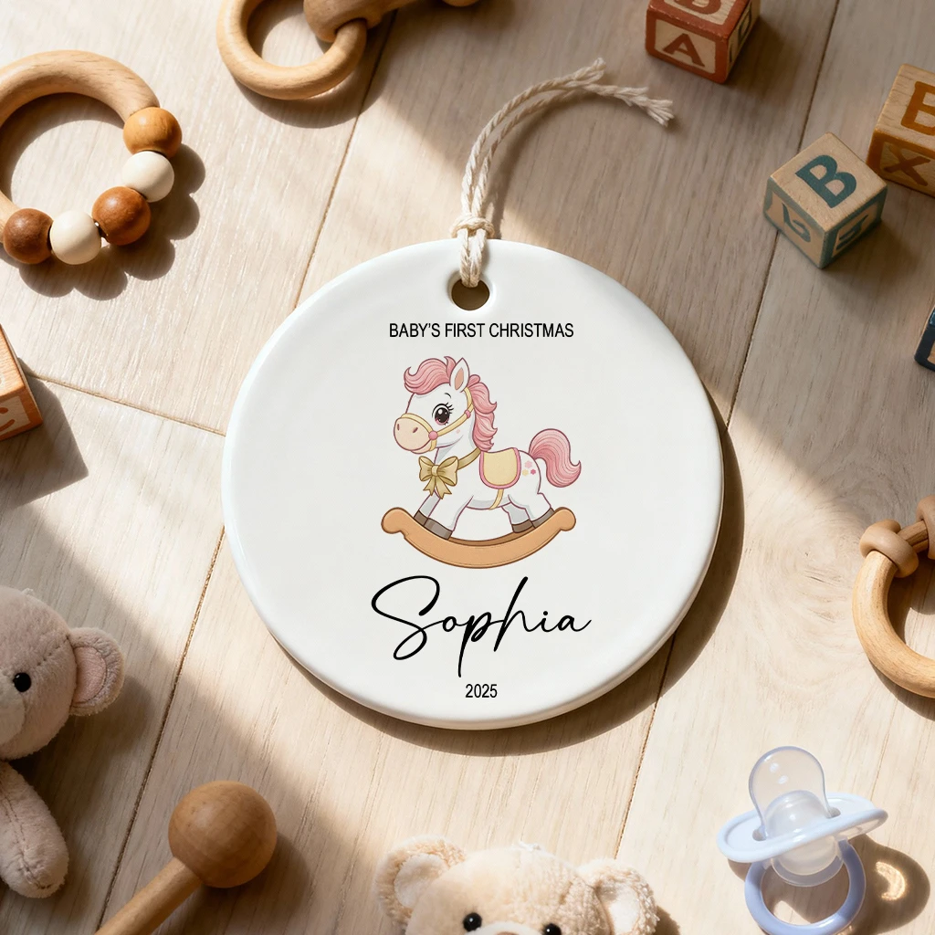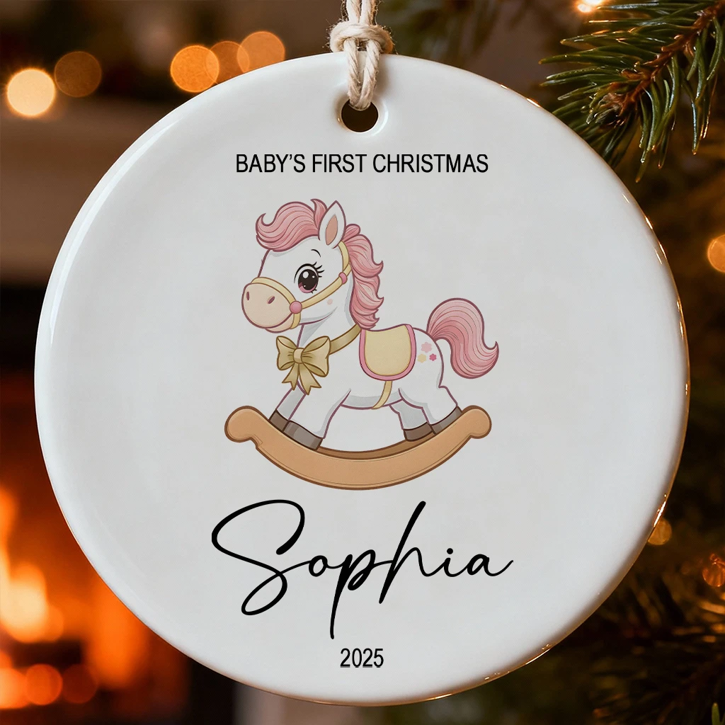 Personalized Porcelain Rocking Horse Baby’s First Christmas Keepsake | Custom Name and 2025 Ornament | Elegant Baby Girl Heirloom Gift