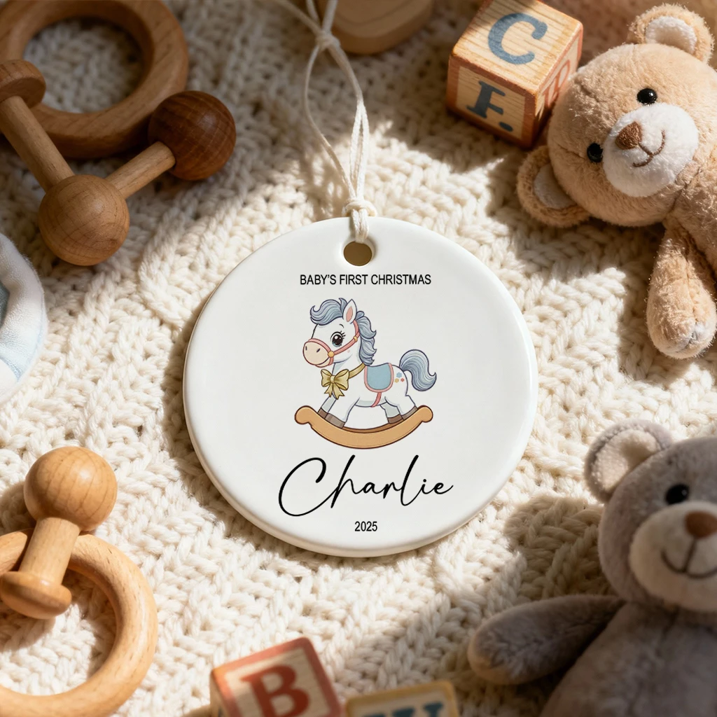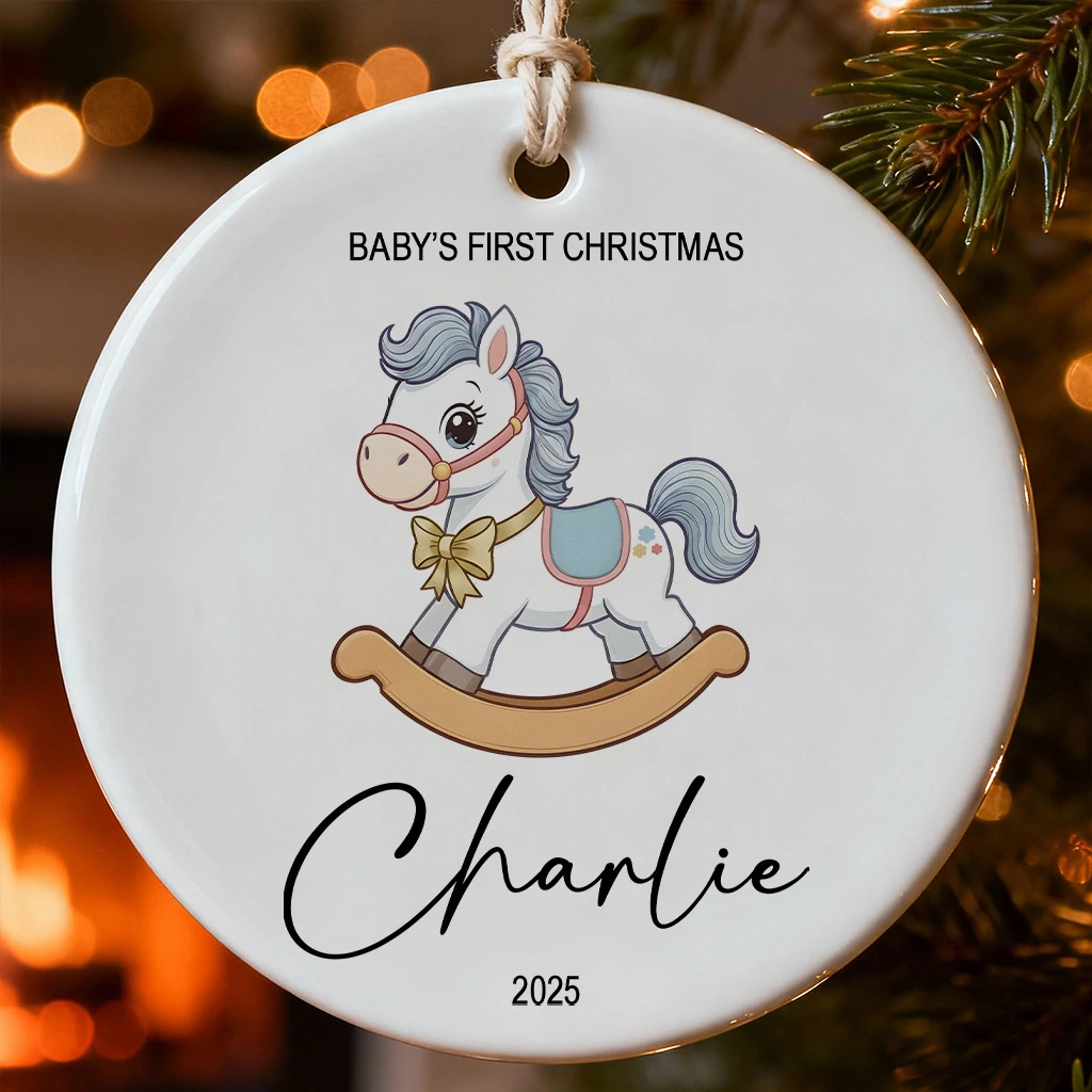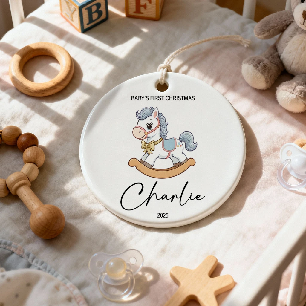 Personalized Porcelain Rocking Horse Baby’s First Christmas Keepsake | Custom Name and 2025 Ornament | Elegant Baby Girl Heirloom Gift