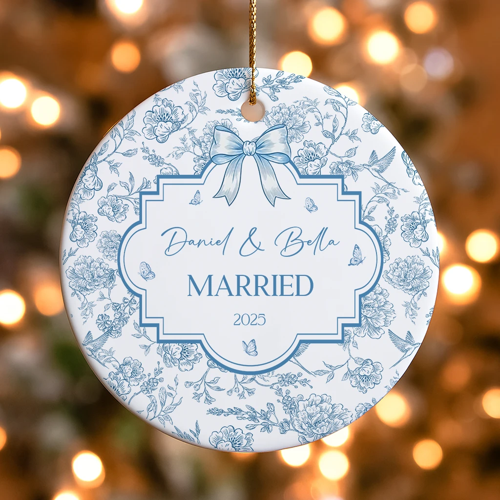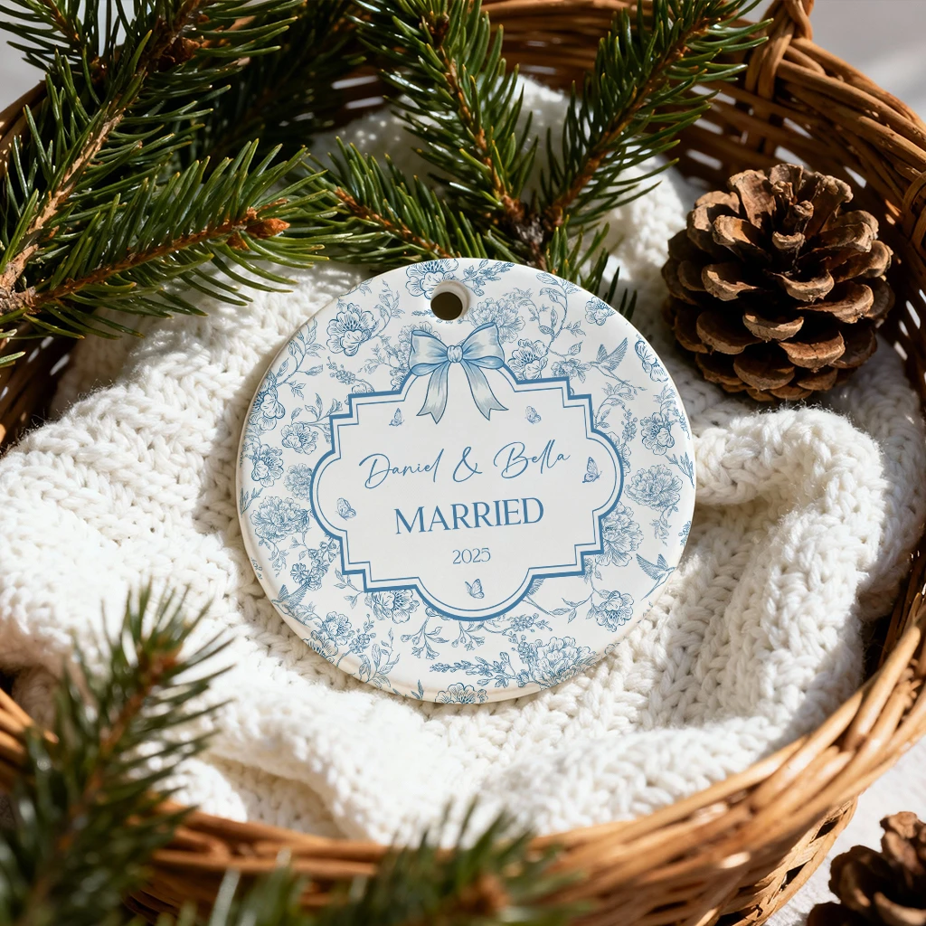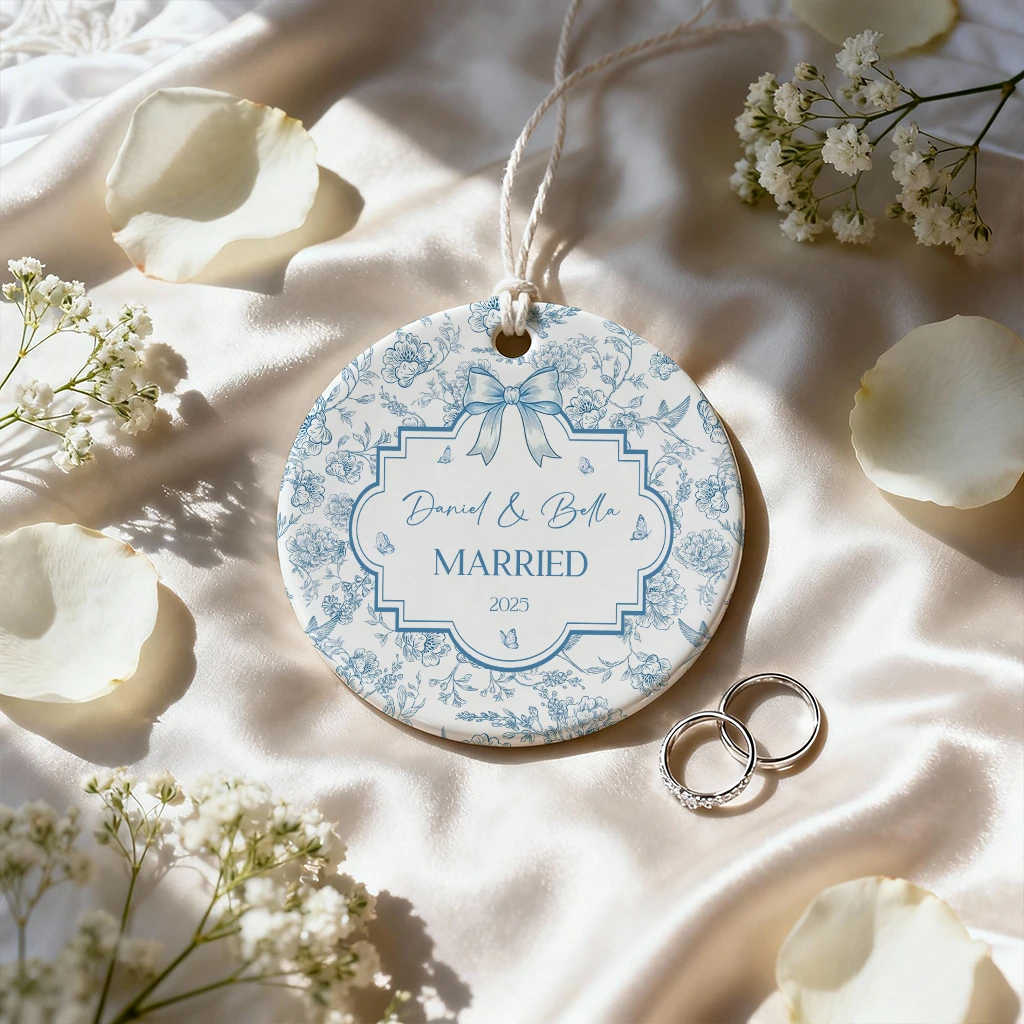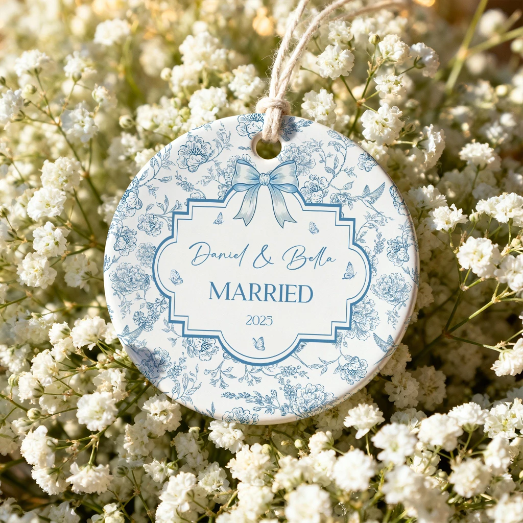 Personalized Wedding Keepsake Ornament | Blue Floral Couple Name & Date Tag | Custom Married 2025 Gift | First Christmas Ornament
