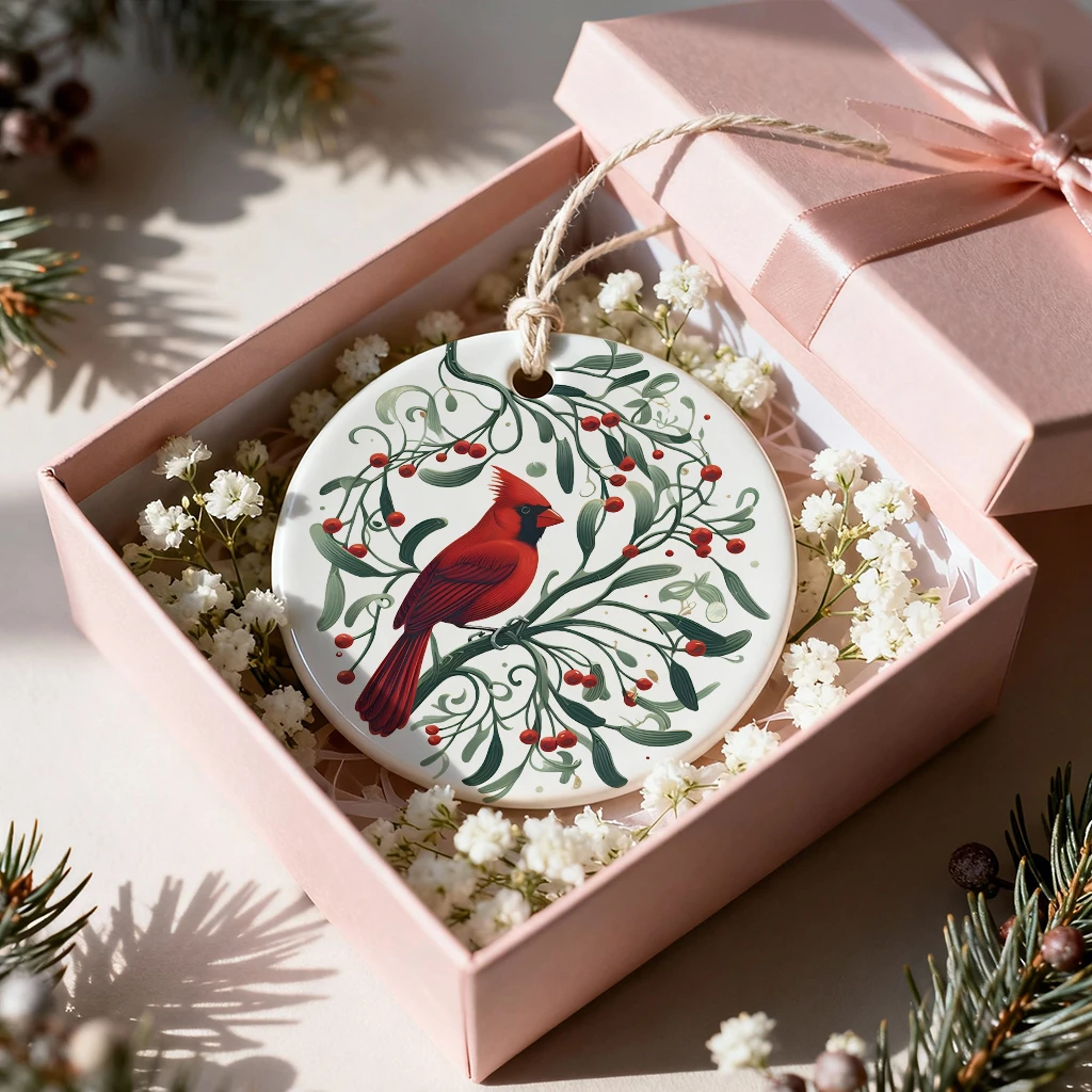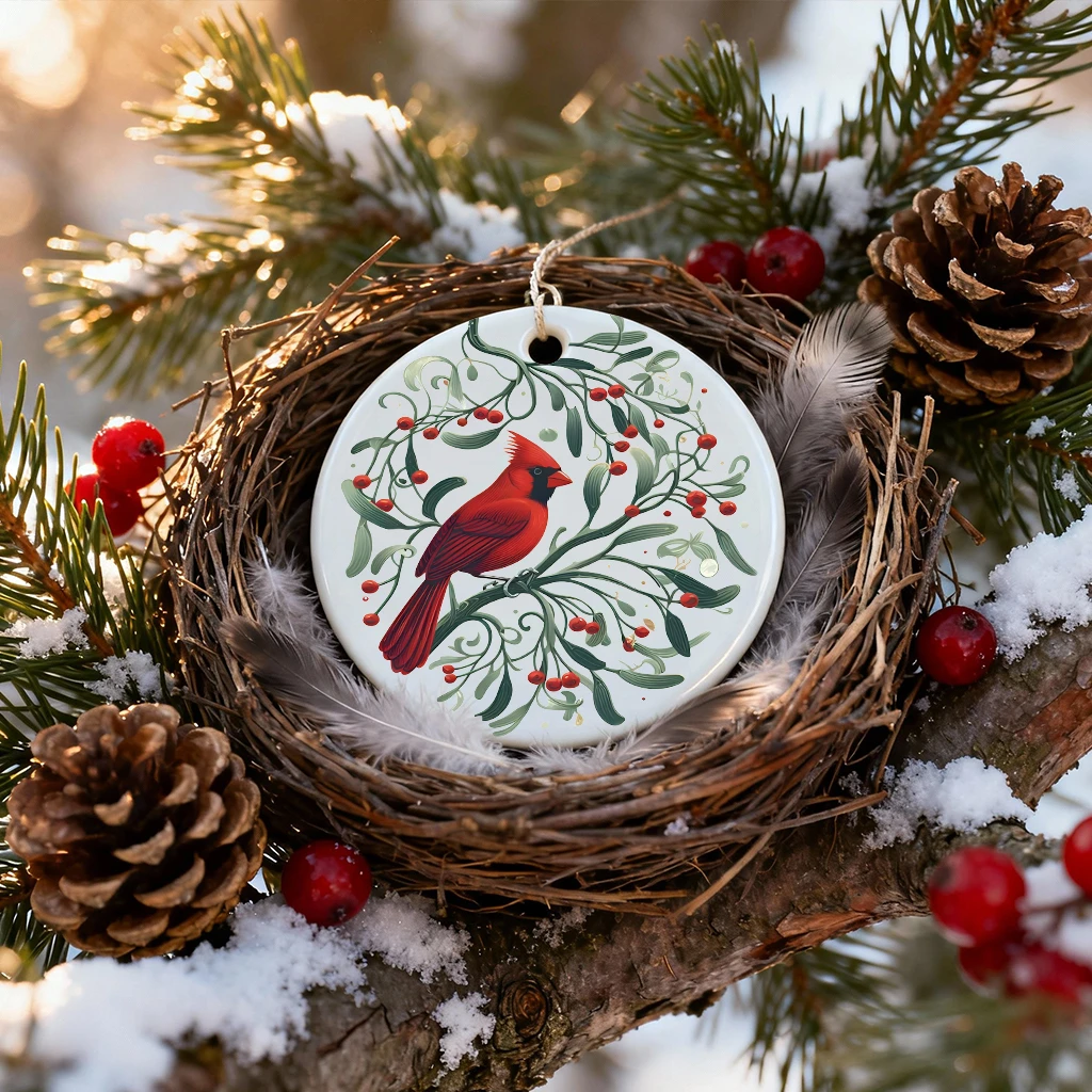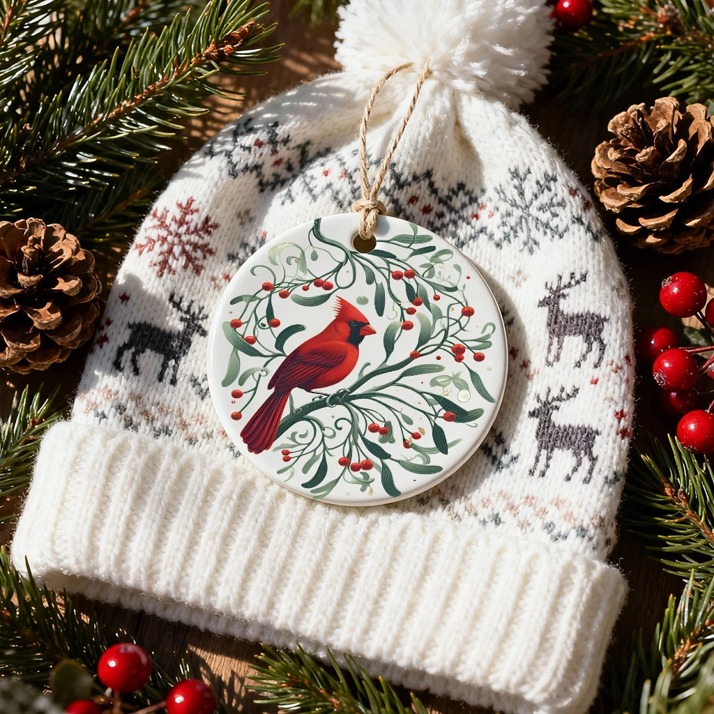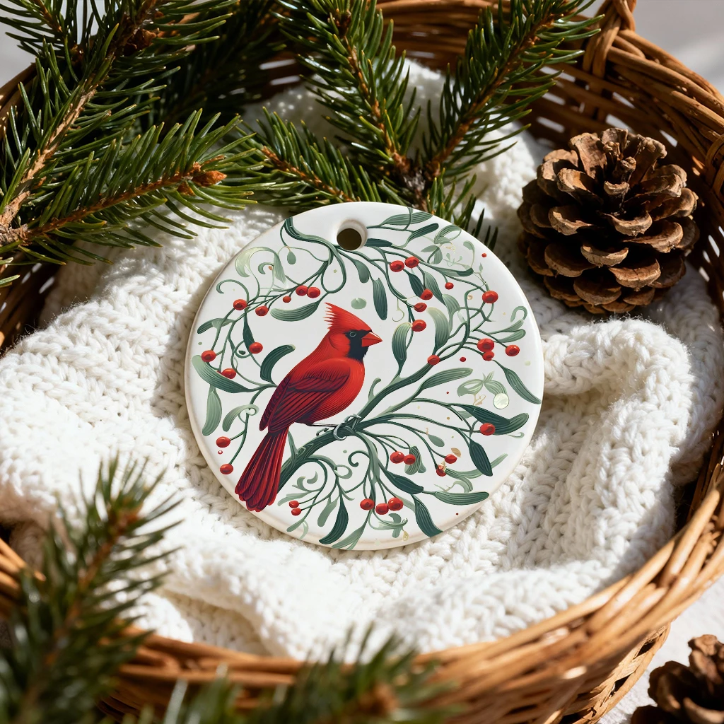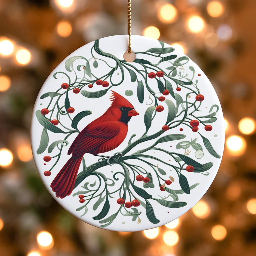 Red Cardinal Christmas Ornament 2025 | Mistletoe Berry Bird Ceramic Disc | Winter Tree Decor | Bird Lover Gift