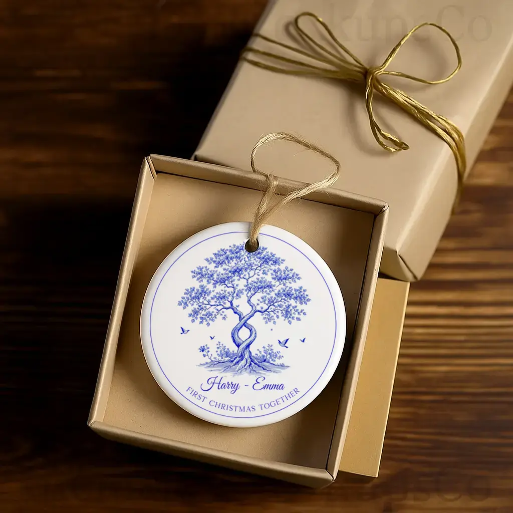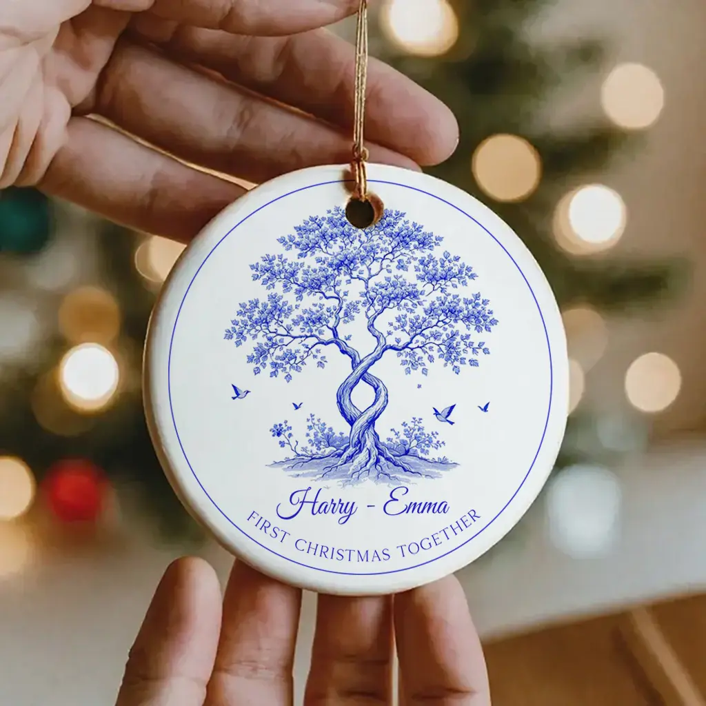 Romantic Toile Love Tree Engaged Ornament, Personalized Blue & White Couple Gift, First Christmas Keepsake, Custom Ceramic Tree Decor 2025