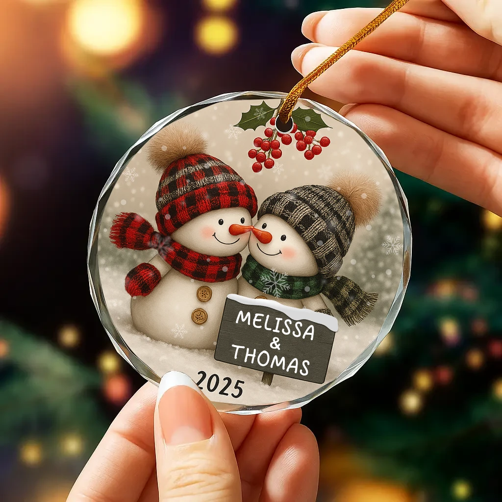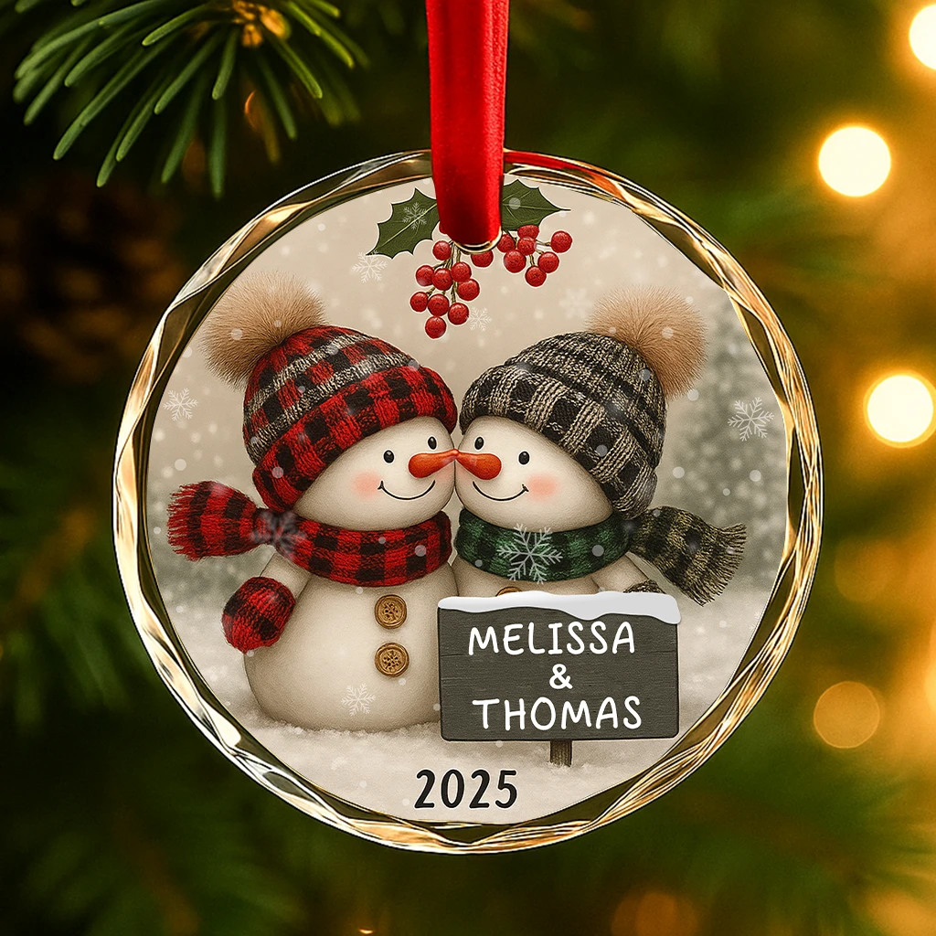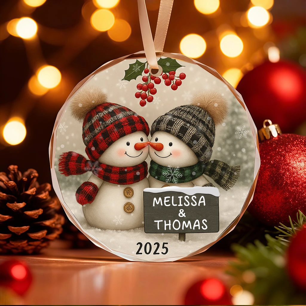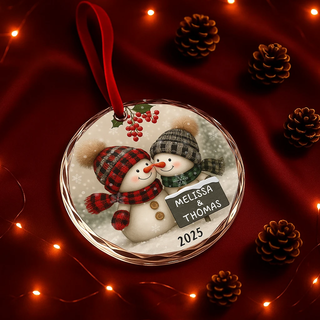 Winter Snowman Couple Ornament | Plaid Hat and Scarf Christmas Decoration | Personalized Holiday Gift