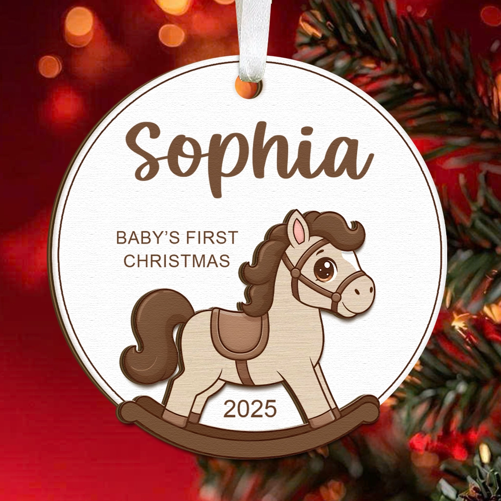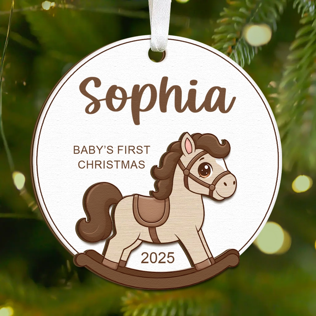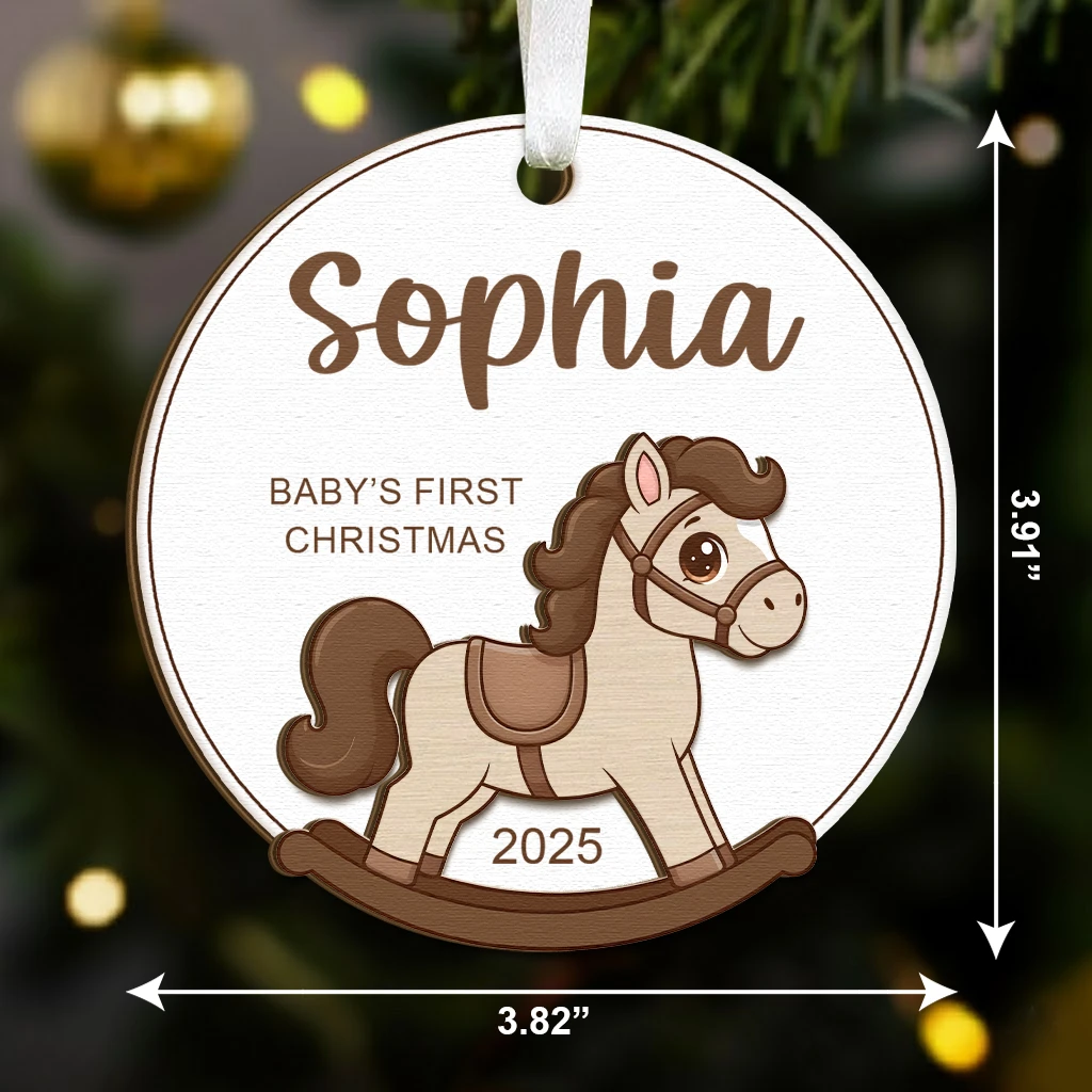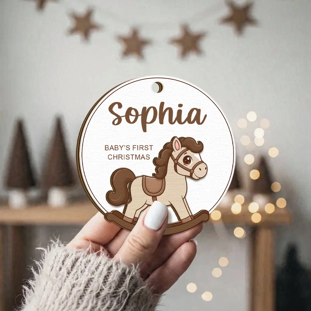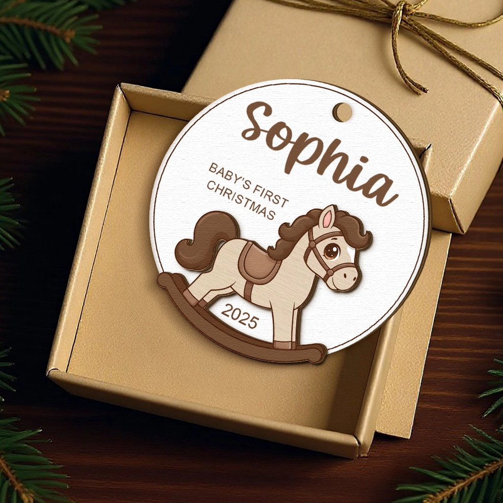 Wooden Rocking Horse Baby Ornament 2025 | Personalized Engraved Name Christmas Decor | Rustic Nursery Keepsake | First Year Bauble